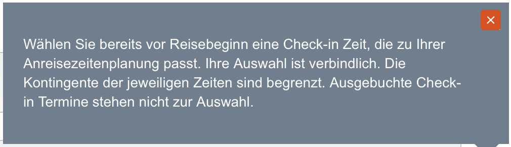 sollte jemand die Check-in Zeit 10:15 Uhr gewählt haben, schaut bitte unbedingt ins Manifest. Bei uns ist sie verschwunden und die Frühste ist jetzt 11:25 Uhr und muss neu ausgewählt werden.
