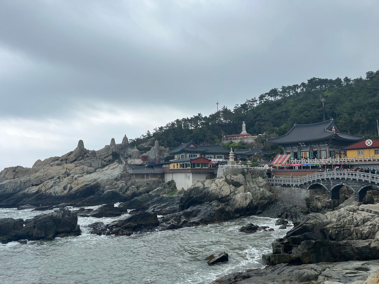 200 US-Dollar war der ausgemachte Preis, zu viert kein Problem. Noch vor den Bussen sind wir zu dem Haedong Yonggungsa Tempel außerhalb der Stadt gefahren. Einer der schönsten Tempel Koreas mit der spektakulären Lage direkt am Meer. Da jeder Koreaner einmal im Leben diesen Tempel besuchen soll, war es schon in der Früh sehr voll. Wir haben in einer Stunde alles gesehen und traten den Weg zurück nach Busan an.