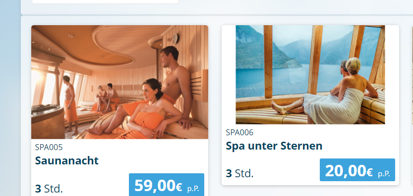 Tatsächlich… habe auch gerade bei meiner Perla Reise nachgeschaut. Da sind verschiedene Sauna Events, allerdings steht da jeweils, dass der Termin an Bord bekannt gegeben wird.