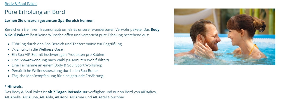 ich hoffe ich bin hier richtig bei euch :) Mein Verlobter und ich sind Anfang April für eine Woche auf der AIDAblu unterwegs. Wir sind begeisterte Saunagänger und gerade im April wo es doch noch nicht so warm sein wird im Mittelmeer, würden wir gerne das Body & Soul Paket buchen, das so ja auf der AIDA Homepage beworben wird: