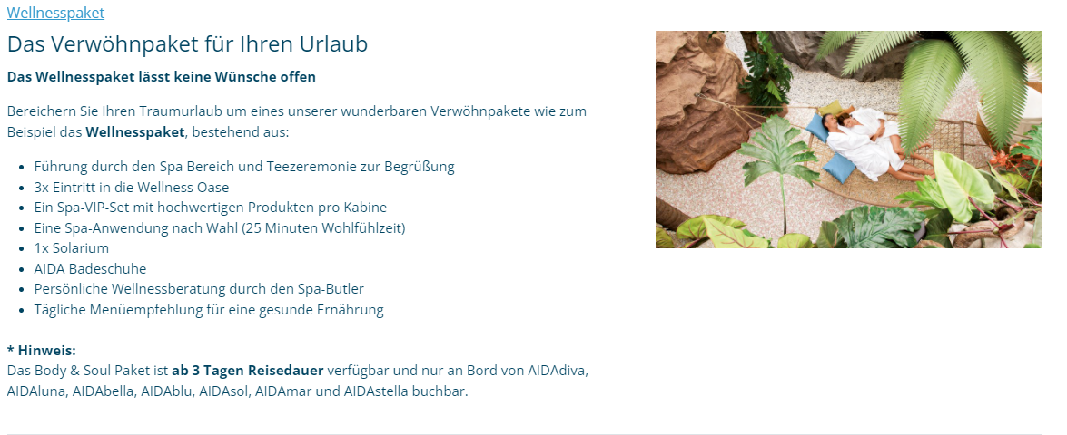 ich hoffe ich bin hier richtig bei euch :) Mein Verlobter und ich sind Anfang April für eine Woche auf der AIDAblu unterwegs. Wir sind begeisterte Saunagänger und gerade im April wo es doch noch nicht so warm sein wird im Mittelmeer, würden wir gerne das Body & Soul Paket buchen, das so ja auf der AIDA Homepage beworben wird:
