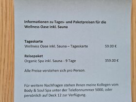 Ich hatte mich beim Clubtreffen ja mit der Chief Purserin unterhalten und auch gefragt, ob und wann es wieder Tageskarten geben soll und auch eine Flatrate. Sie meinte, dass es da was geben soll und sie sich nochmal bei uns meldet. Gestern hatten wir dann die Info hierzu auf der Kabine. Finde die Preise aber absolut nicht lohnenswert