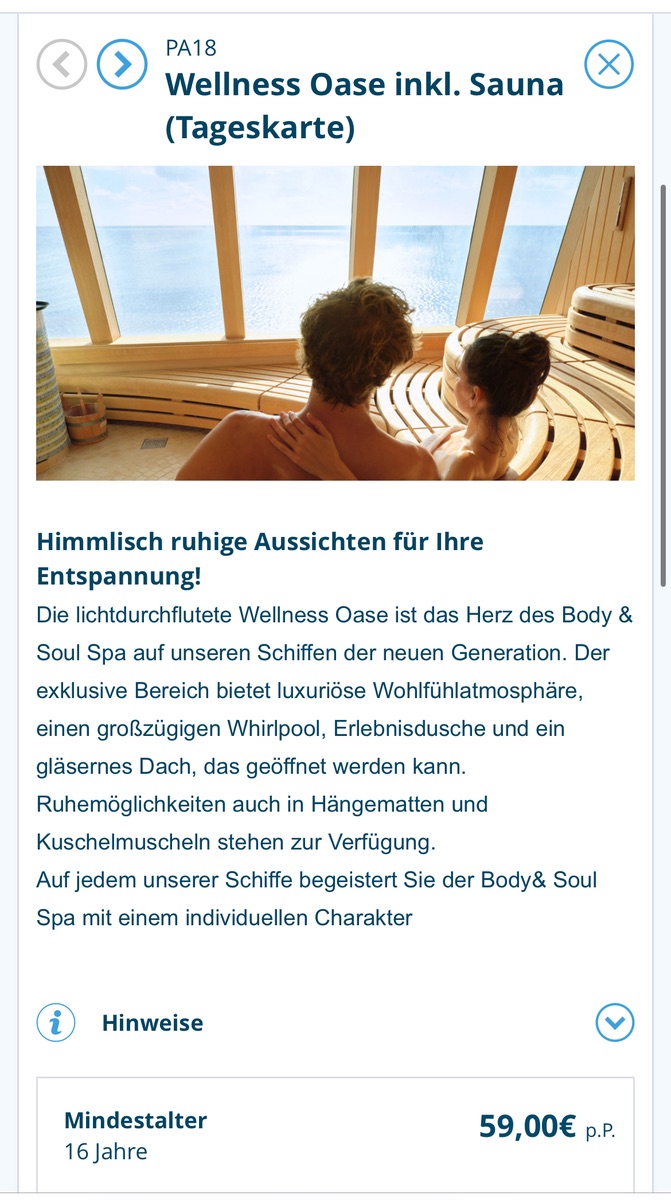 Das ist korrekt. Deswegen finde ich es auch gut, dass Aida da verschiedene Tarife anbietet. Da findet mit Sicherheit jeder Saunagänger etwas