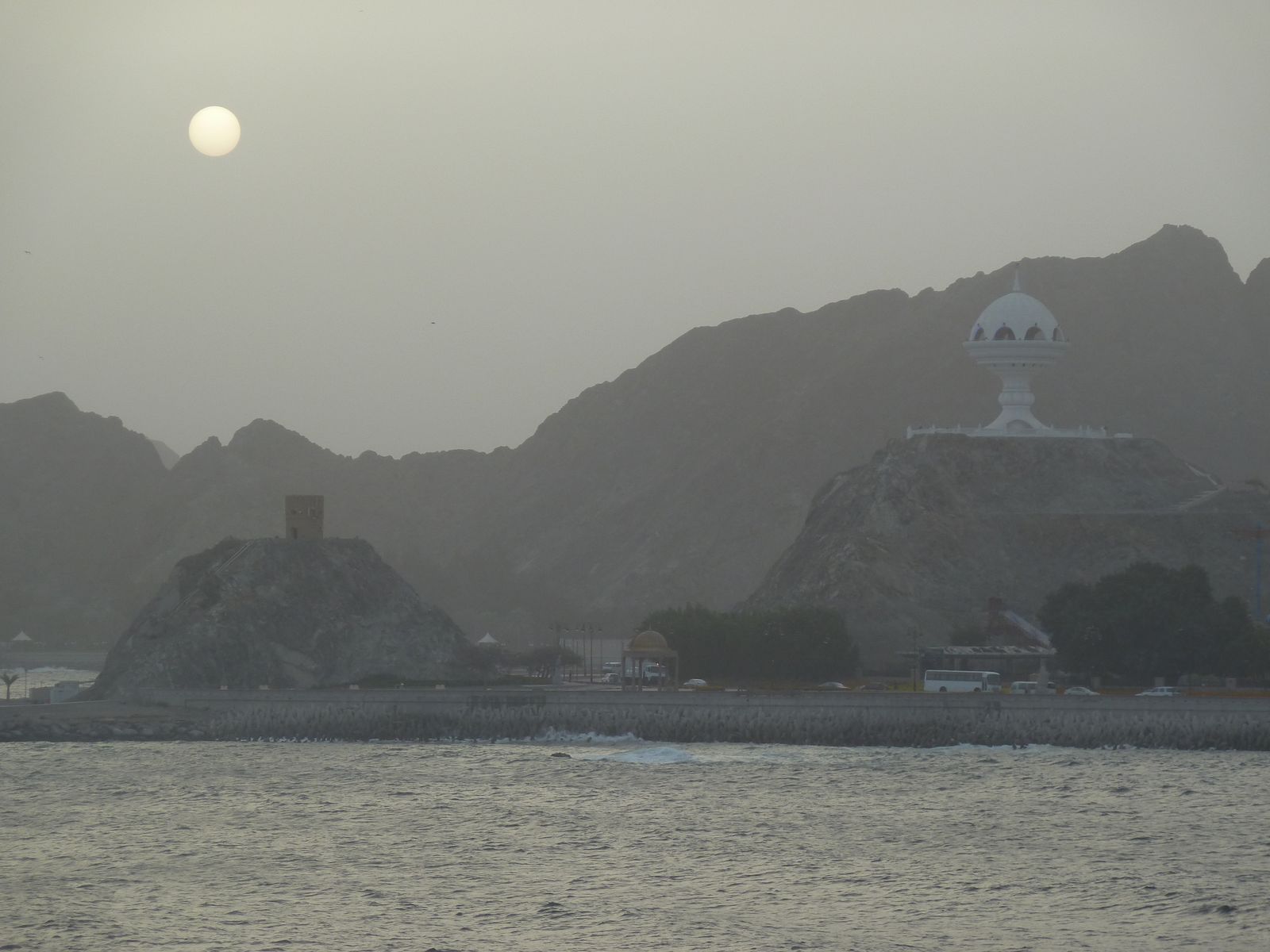 Ganz besonders zog mich damals jedoch die spektakuläre Kulisse des Naturhafens von Muscat in ihren Bann. Zweimal konnte ich dort den Sonnenaufgang über den gezackten Bergen genießen .....