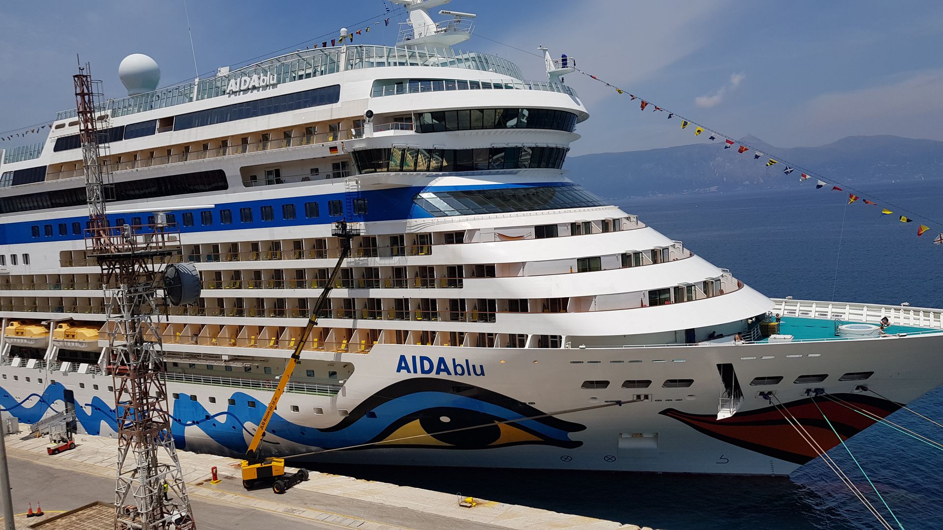 wir sind an Bord der Mein Schiff 5 und haben gerade gegenüber der blu festgemacht. Die blu ist ein wunderschöner Anblick und das Wetter ist auch top. Toll, dass jetzt Kreuzfahren wieder besser geht. Ich wünsche allen, die heute ihre Cruise beginnen, einen wunderbaren Urlaub und denjenigen, die absteigen müssen, eine gesunde Heimkehr.