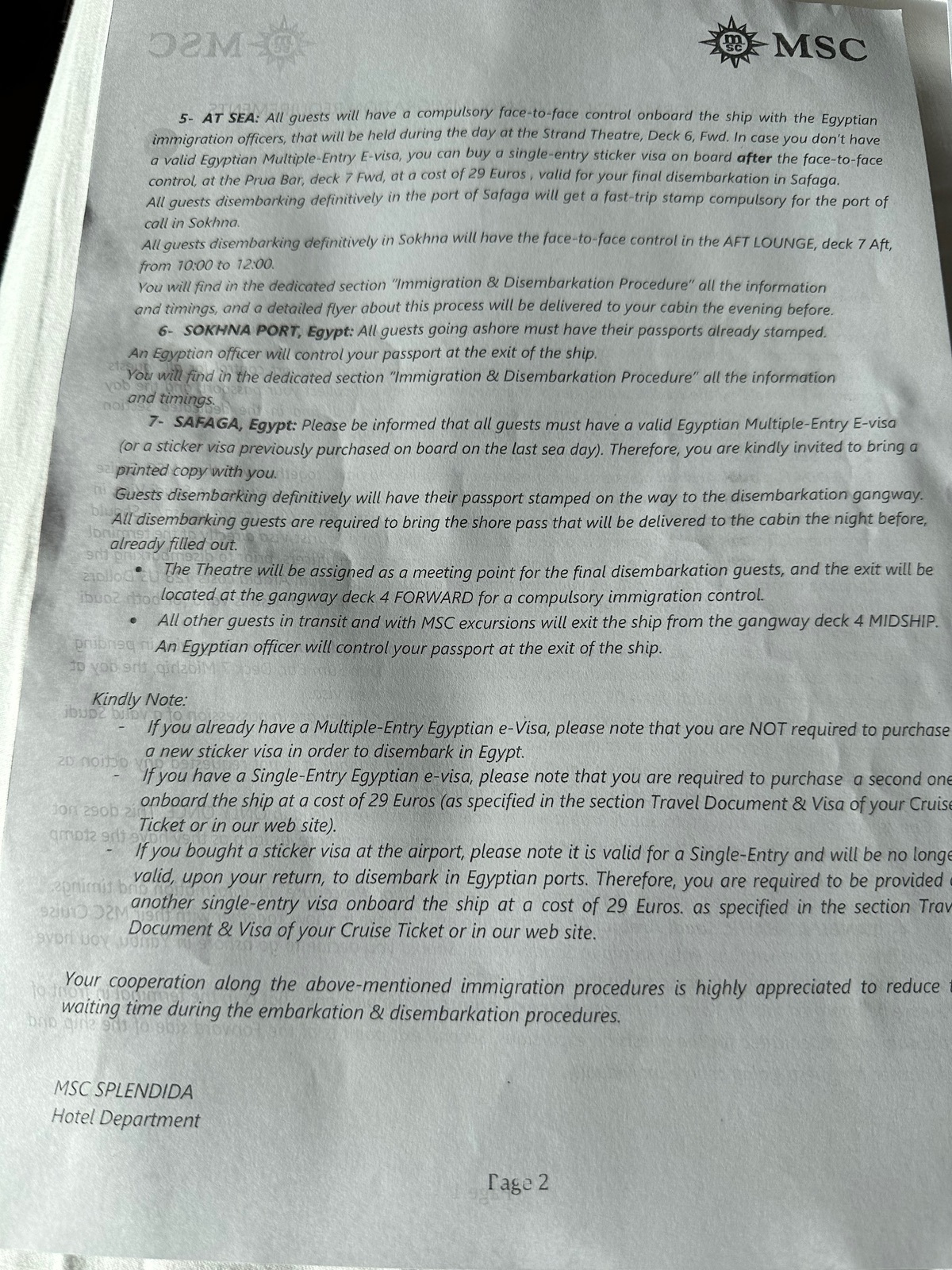 Ägyptisches Visum: wichtig war ein Mehrfacheinreisevisum zu besorgen. Ich habe es über den von MSC veröffentlichten Link gemacht, 60 Dollar bezahlt und das Visum war innerhalb weniger Tage da.