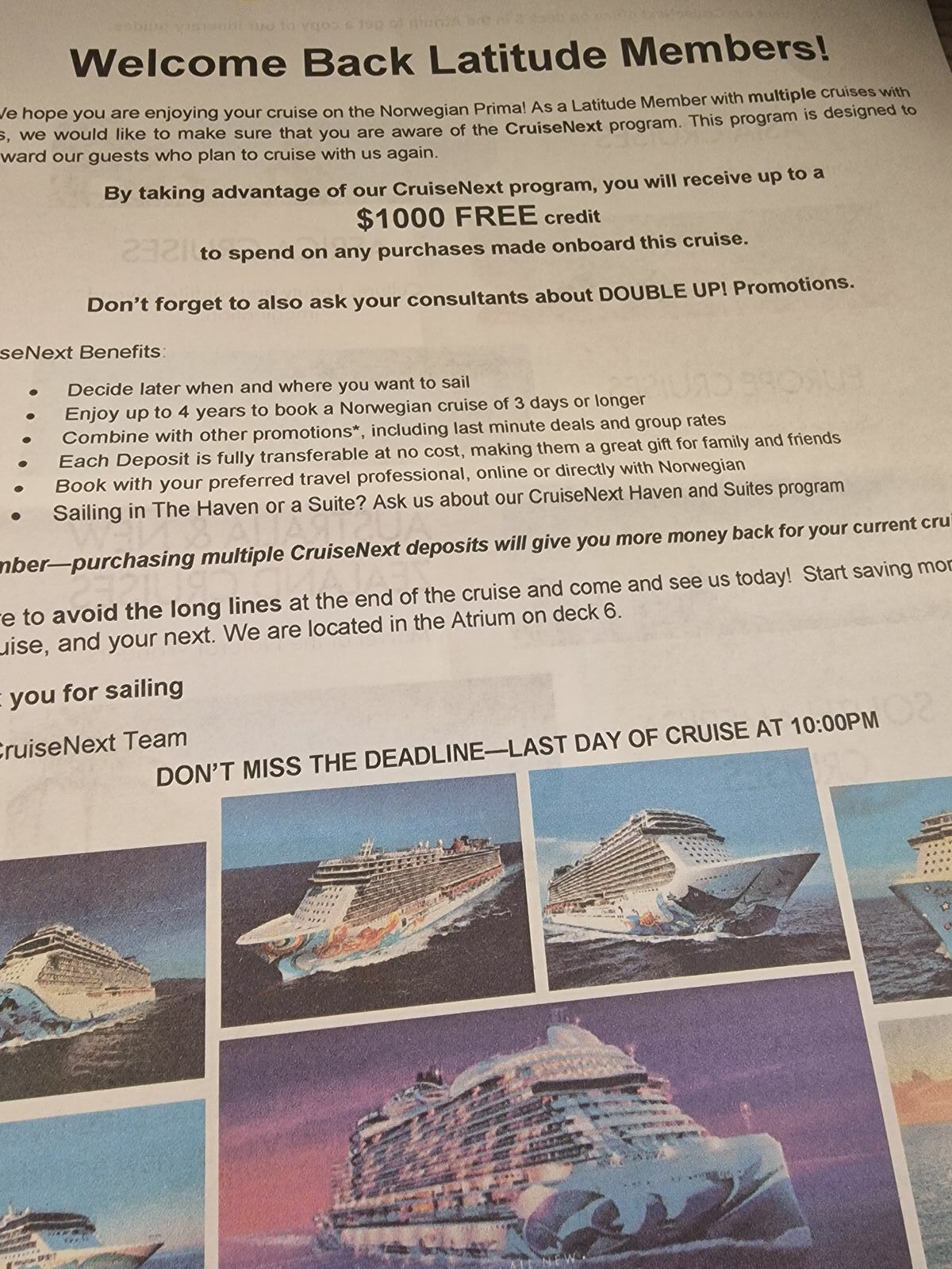 Novesia, es wirs morgen ein CruiseNext Event geben, wo die Vorteile der an Bord Buchung erklärt werden. Ich schreib dann mal wenn wir wieder im Hafen sind, was dazu. Oder vielleicht reicht Dir das?