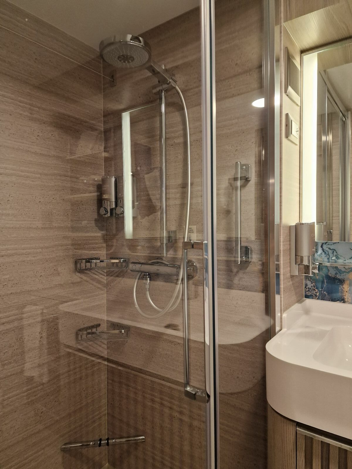 Noch was zur Kabine. Sie ist schön groß und absolut edel eingerichtet, aber es fehlen Ablagemöglichkeiten. Für mich allein reicht es, bei zwei nicht mehr, an 2+Kind, mag ich gar nicht denken.... Auch der Schrankplatz dürfte zu klein sein. Da hätte man viel mehr draus machen können, weil Platz genug ist ja in der Kabine. Wenn ich da an meine Kabine auf der World Europa denke, um Längen sinnvoller eingerichtet, mit ganz viel Ablageplatz überall.