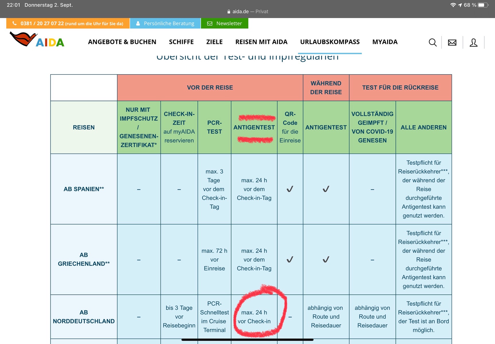 Aida hat uns heute mitgeteilt das wir zu den zusätzlichen Test, nochmal einen PCR Test machen müssen, "am Terminal" aufgrund dieser Orangen Liste