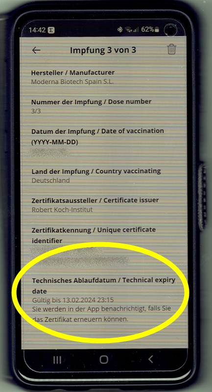 Bei mir in der Corona WarnApp steht beim Impfzertifikat „technisches Ablaufdatum 23. 6. 2023“. Ich bin viermal geimpft und einmal genesen. Dievierte Impfung war wohl bei mir im Juni 22.