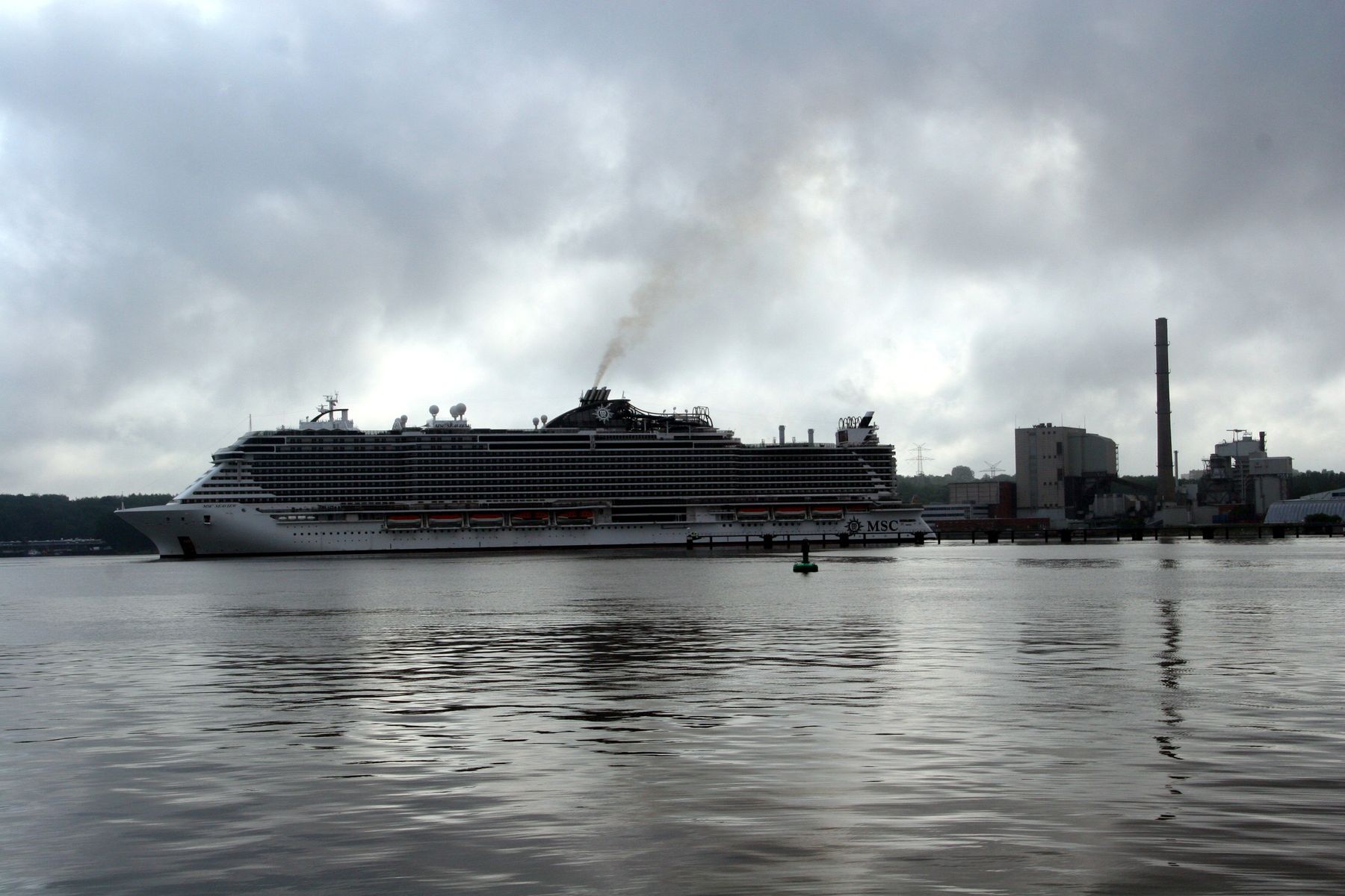 Die MSC Seaview fährt am 30.06.2021 um 08:03h unter einem wolkenreichen Himmel mit einem kräftigen "Heizergruß" rückwärts das Anlegemanöver im Ostuferhafen zum Liegeplatz 1