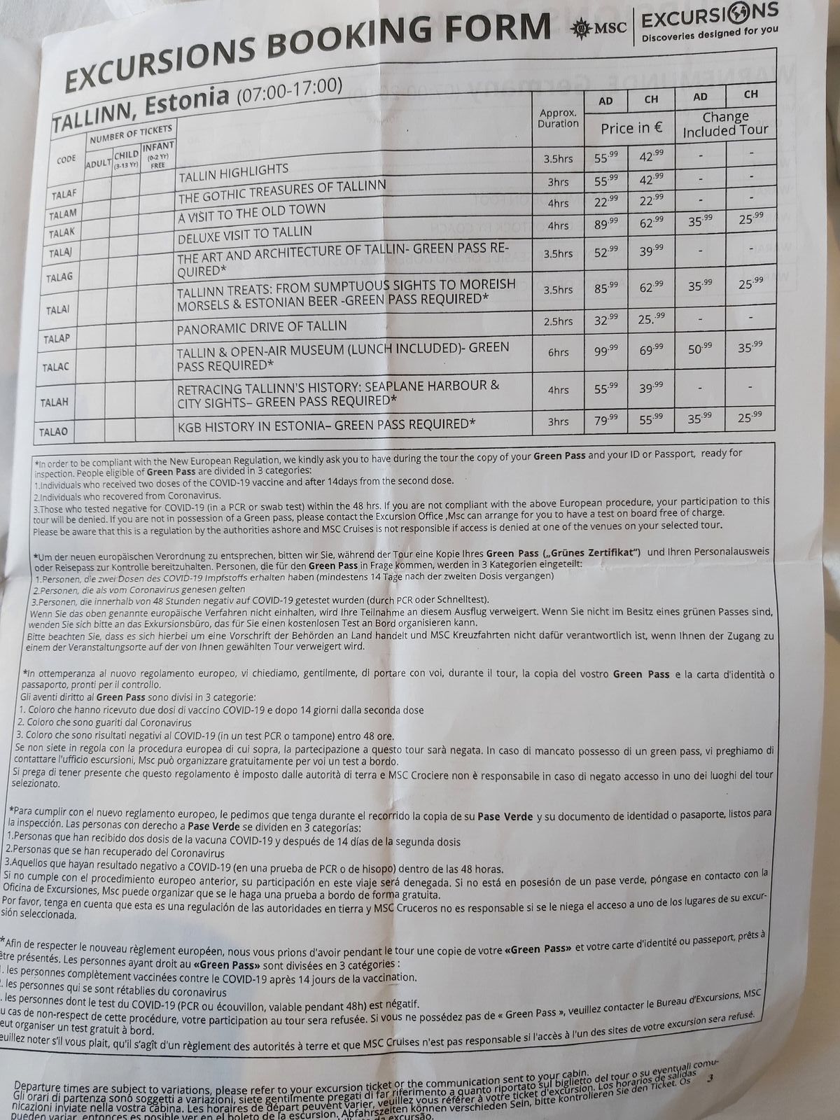 Hier mal die Übersicht der Tallin- Ausflüge. Es ist gut ersichtlich für welche der GreenPass erforderlich ist