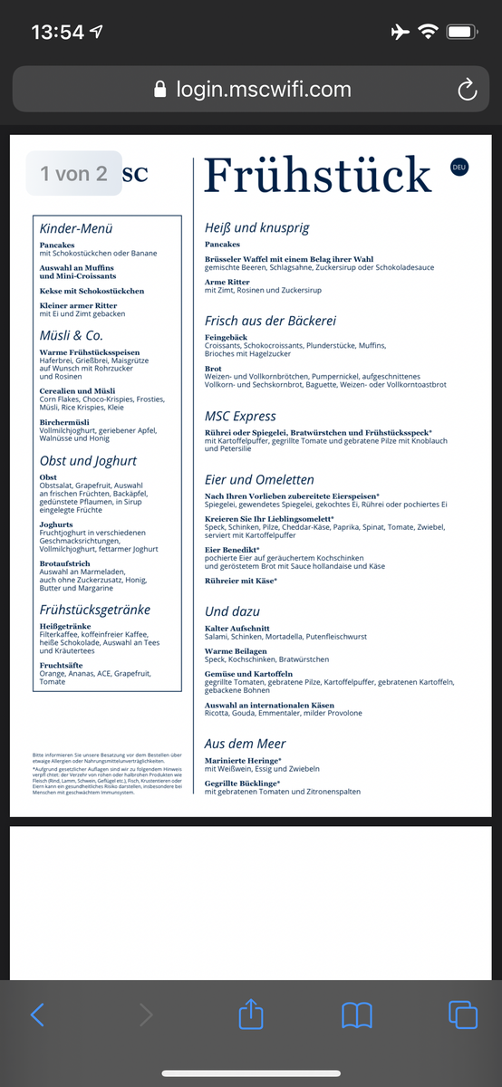 Hallo, in der Anlage die heutigen drei Menükarten vom Bedienrestaurant in der „Holzklasse“ also Nicht Yacht Club, bisher war alles gegessene lecker :thumbsup:
