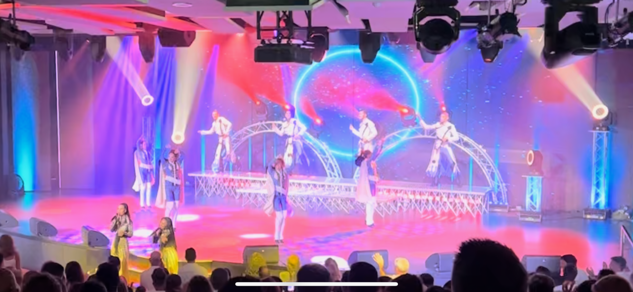 Die Abba Show in Genua war ein wenig enttäuschend. Nur zwei Sänger. Und 8 Tänzer wirkten auf dem viel zu großen Bühnenbild etwas verloren: