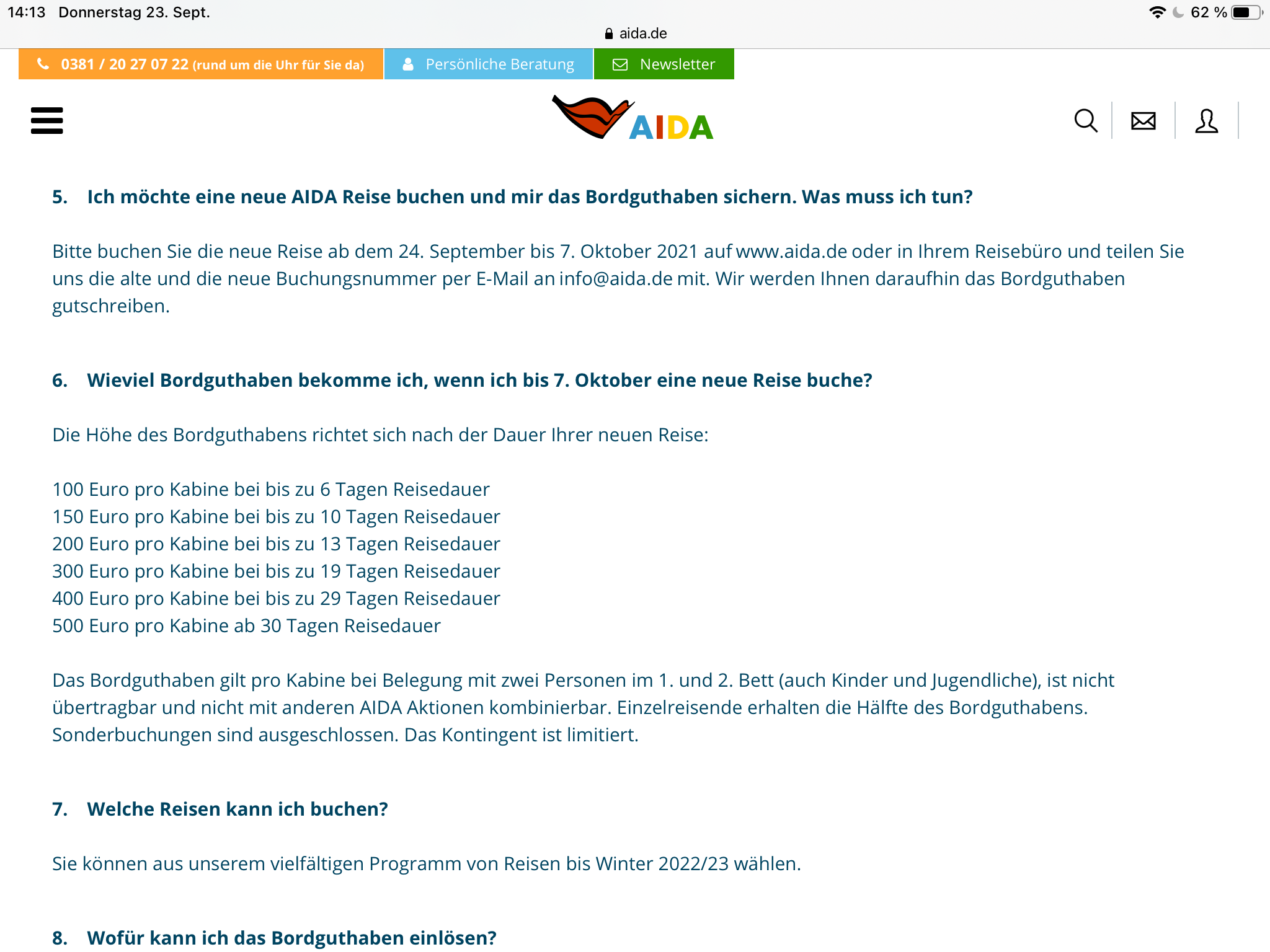 Habe soeben mit einem Reiseberater von AIDA telefoniert - kam zu meiner großen Überraschung auch schnell durch - Wartezeit < 5 Minuten