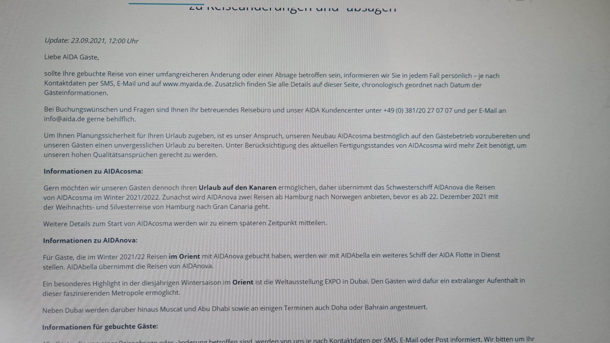 Habe soeben mit einem Reiseberater von AIDA telefoniert - kam zu meiner großen Überraschung auch schnell durch - Wartezeit < 5 Minuten