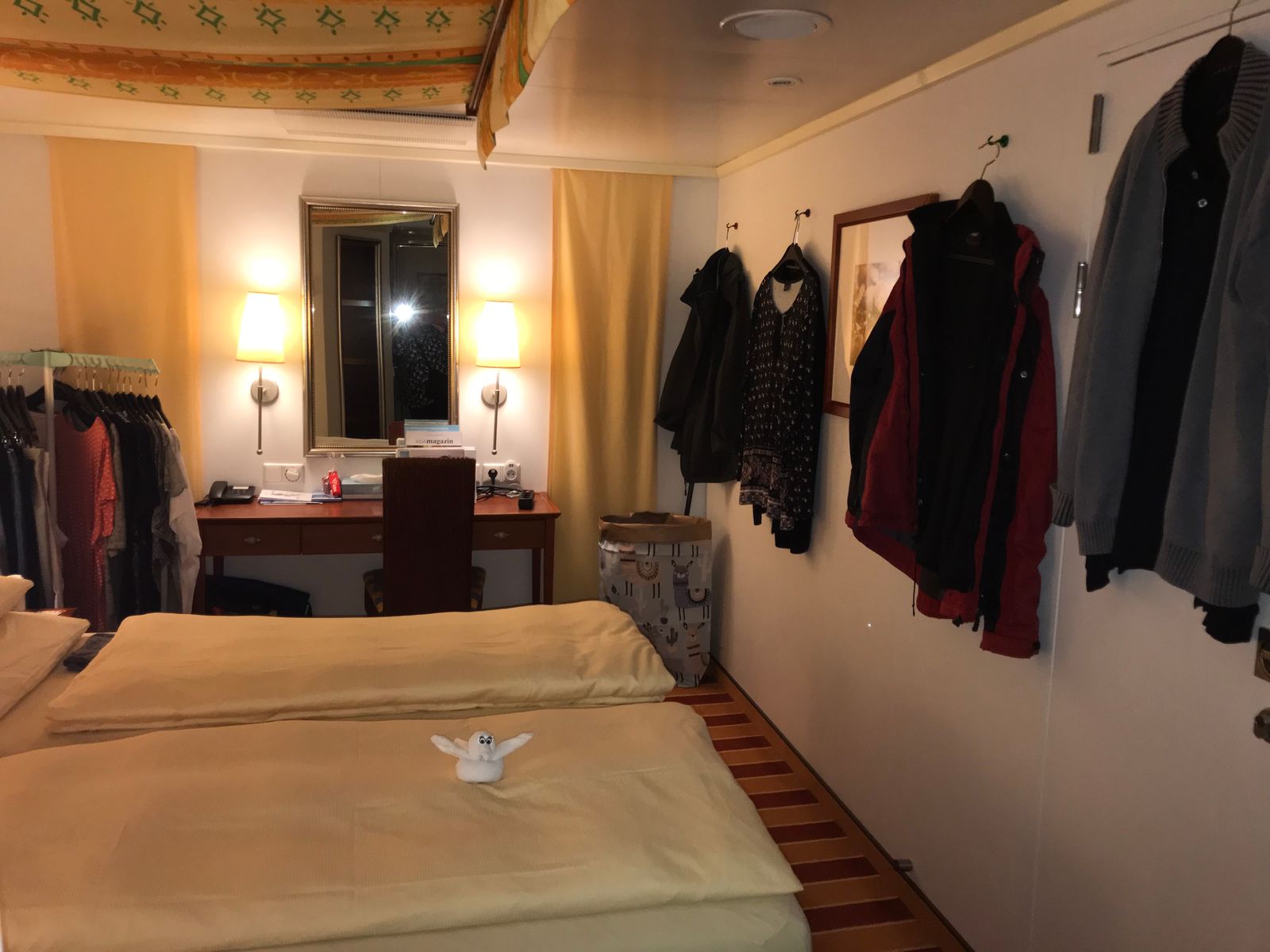 Die Kleiderschränke sind ja nicht so groß, und dank der Haken kann man sperrige Kleidungsstücke einfach an einen beliebigen Platz in der Kabine hängen.