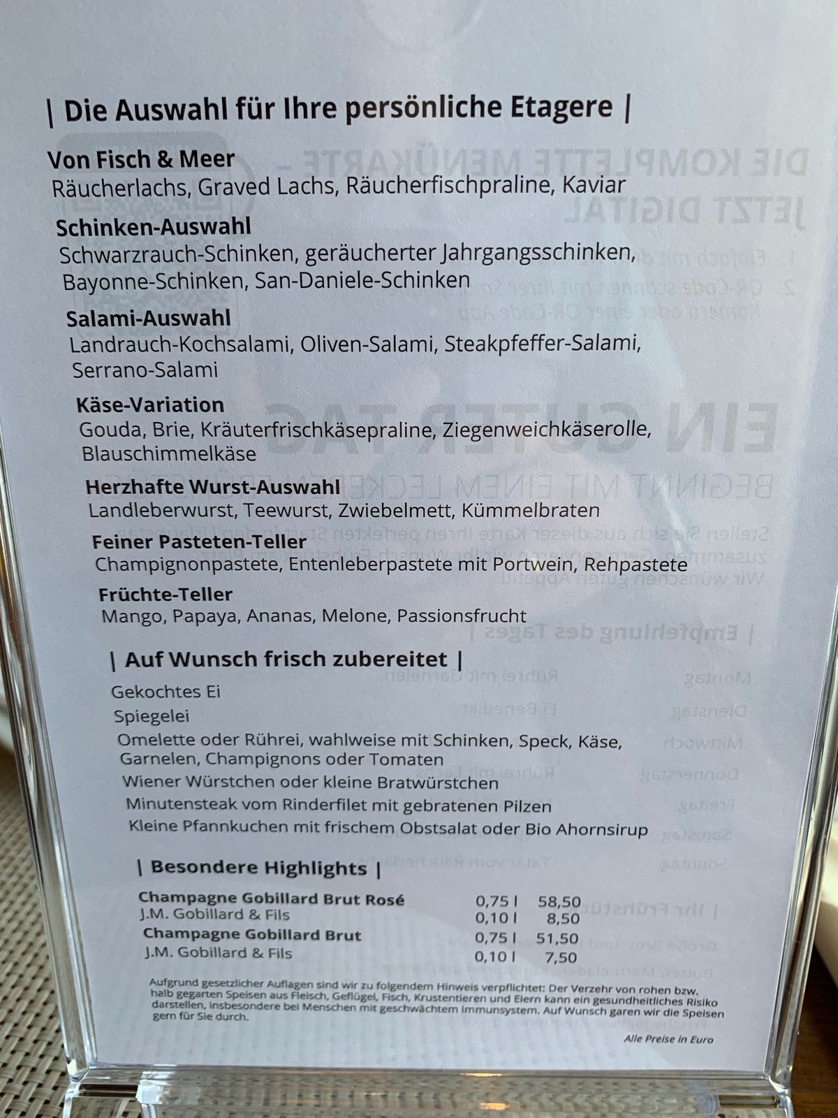 Da die Frage hier gestellt wurde, Unterschied „normales“ Frühstück im Vergleich zum Buffalofrühstück: Hier mal ein paar Bilder inkl Karte. Vieles ist gleich, der Unterschied liegt in den Kleinigkeiten. Die Etagerie gibts auch weiter, hatten wir aber nicht bestellt. Beispiel: Milchreis steht auf keiner Karte, auf Nachfrage hats die Küche schnell für mich zubereitet. Frisch gepresster O Saft, Omelett, andere Marmeladen, etc