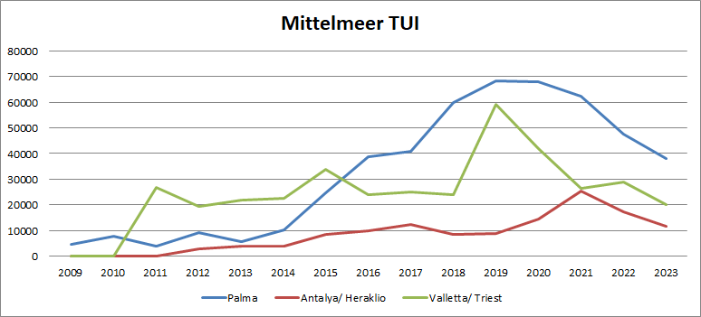 Spannend ist auch, dass die Mein Schiff 2 wirklich nach Antalya fährt. Der Liegeplatz dort ist also doch groß genug. Die Mein Schiff 6 fährt außerdem doch noch im Frühjahr einmal 9 Tage im östlichen Mittelmeer ab/ bis Antalya (wahrscheinlich mit Istanbul), obwohl es ja vor kurzem noch frische anderslautende Hafenmeldungen in Palma gab. Mallorca ist schon seit etwas längerem auf einem konstanten Abwärtstrend. Da kann man fast schon wirklich daran zweifeln, ob TUI wirklich die große Mein Schiff 8 (2050 Kabinen, 161.000 BRZ) in ihrer ersten Sommersaison 2025 im westlichen Mittelmeer einsetzt. Bei dem Trend kann man aktuell eher davon ausgehen, dass sie nach Deutschland kommt und dann z.B. abwechselnd 11 Tage Norwegen und 10 Tage Ostsee ab Kiel fährt. Das ließe sich relativ gut mit den anderen Reedereien abstimmen. Die 8 könnte dann sonntags und wahrscheinlich mittwochs am längeren Liegeplatz am Ostseekai wechseln (belegt sind von Costa der Freitag und abwechselnd Donnerstag und Dienstag und von AIDA der Samstag).