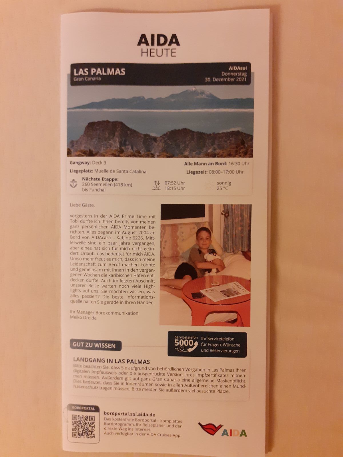 Heute nachmittag war Kapitän Fragestunde im Theatrium. Neben vielen nautischen und technischen Fragen kam dann auch die Frage nach Corona Positiven auf unserer Reise. Felix Rothe sagte, daß die Transparenz, die hier einige fordern nur zu Unruhe unter den Gästen führt. Wie hatten weniger als "Finger an einer Hand an Positiven auf dieser Reise. Alle Kontakt Personen wurden negativ getestet. Das Hygiene Konzept funktioniert." Mit dieser Info möchte ich den nachfolgenden Gästen unserer Reise Mut machen. Lasst euch die Vorfreude nicht verderben. Felix Rothe sagte auf Nachfrage noch, daß er auch die nachfolgende Reise ab 07.01.22 auf der Sol bleibt. Freut euch auf diesen sehr sympathischen Kapitän ! Damit ist dann hoffentlich auch die Aussage, daß Aida die positiven Fälle "unter den Teppich kehrt" beantwortet !
