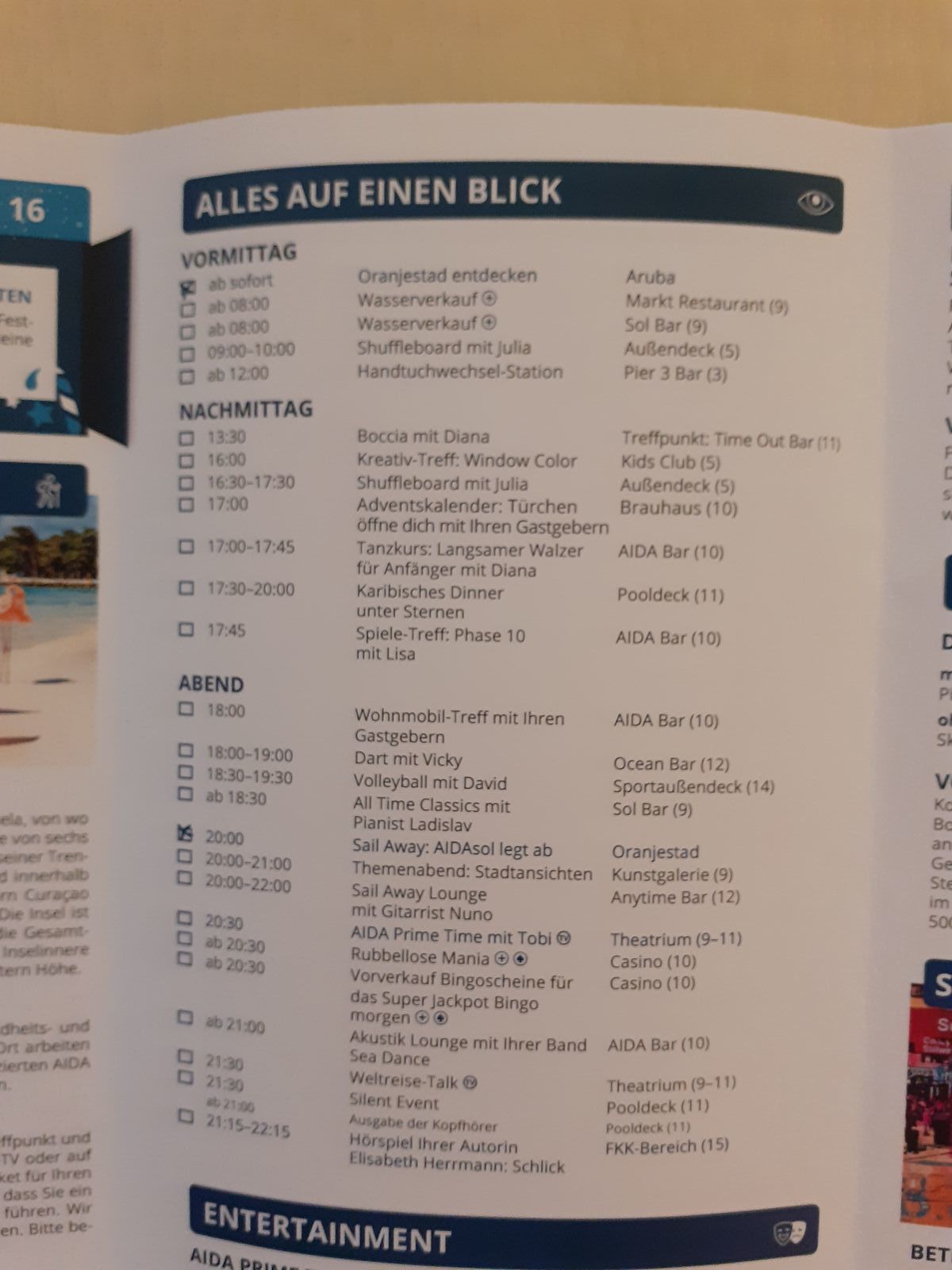 Ich hoffe ihr könnt es lesen 17.30 - 20 Uhr "Karibisches Dinner unter Sternen auf dem Pooldeck" !