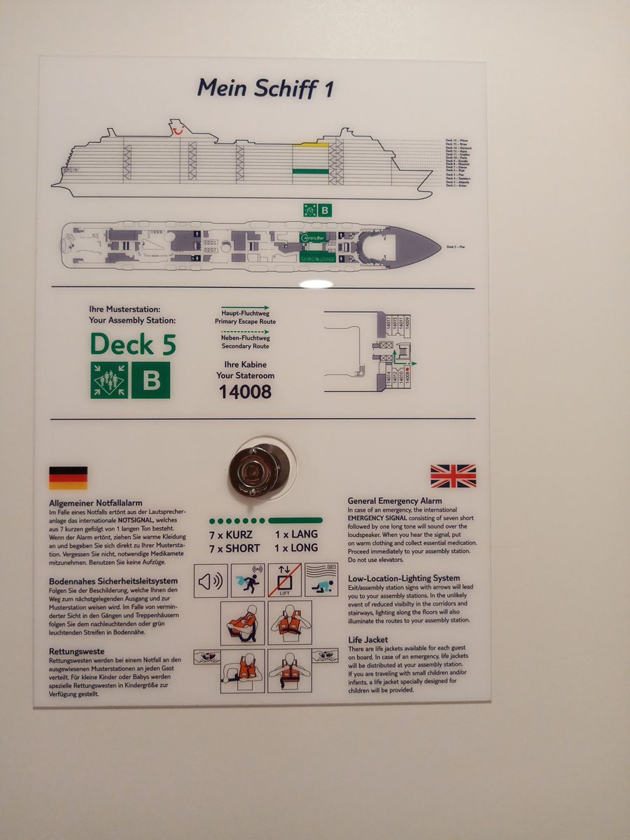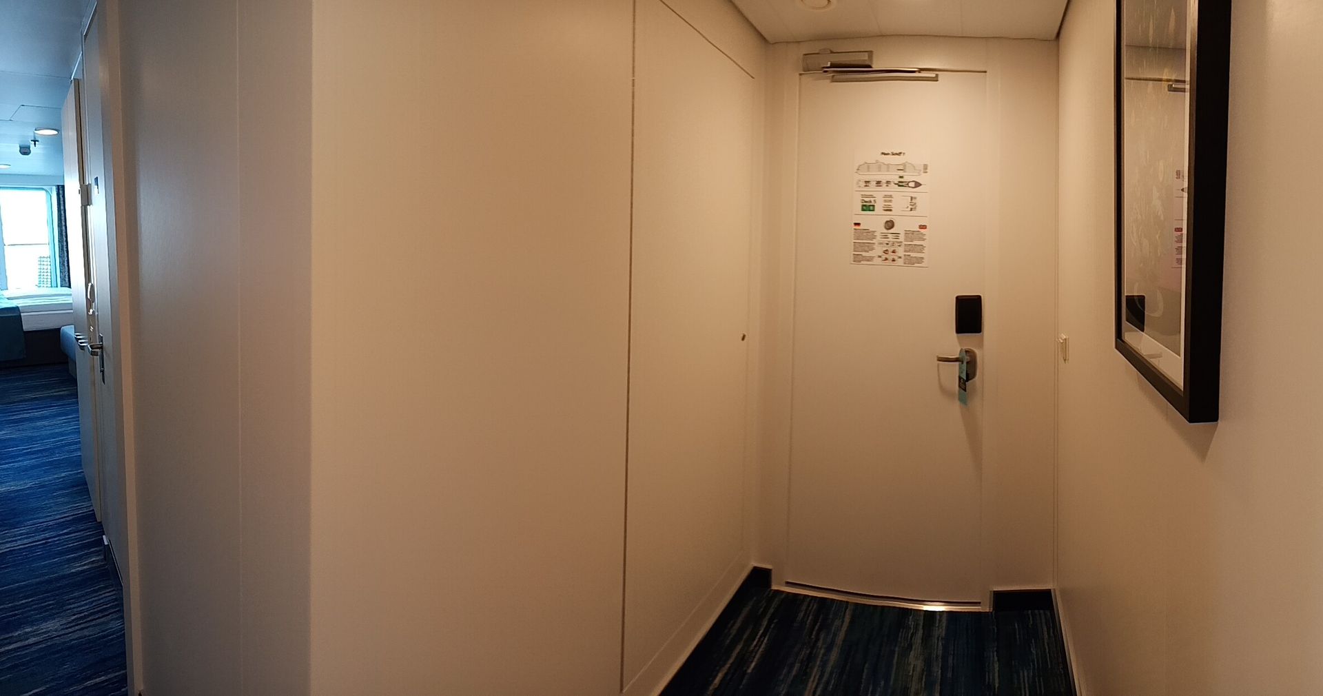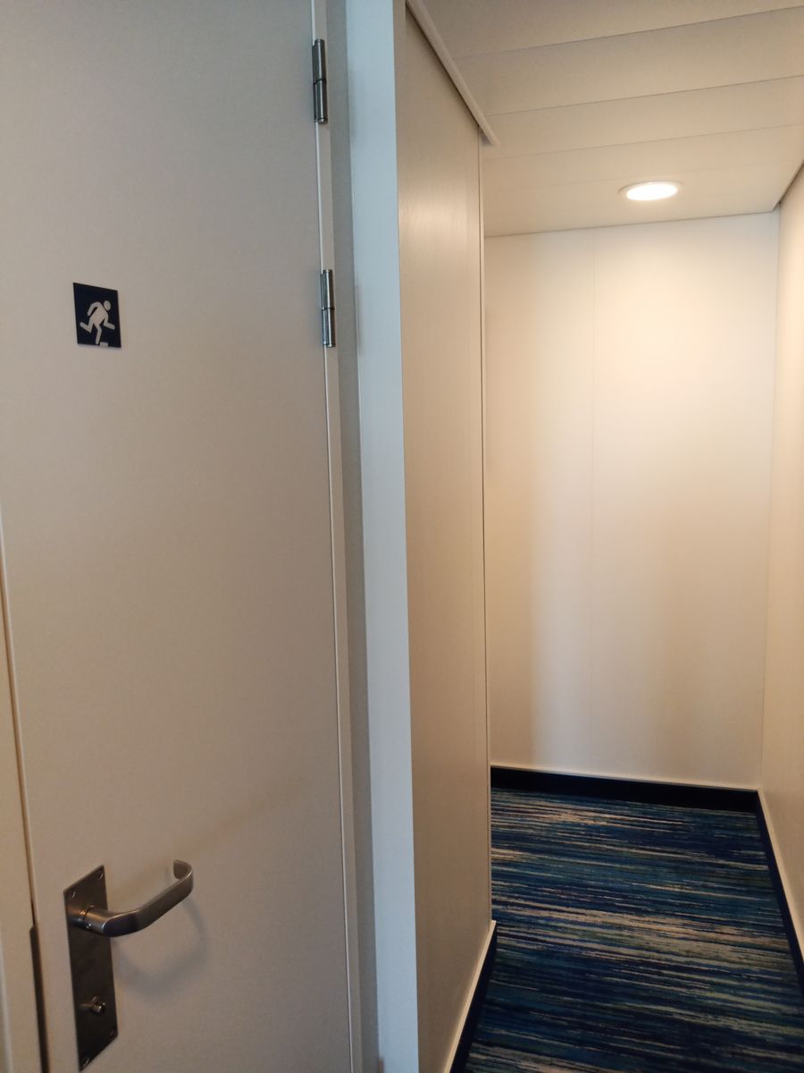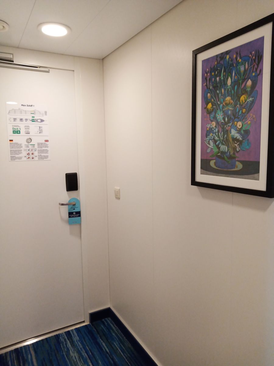 Interessant war für uns diese andere Aufteilung – so eine Art „Eingangsbereich“. Wenn man die Kabinentür von außen öffnet, schaut man nicht sofort auf die Betten der Kabine. Sondern man geht zwei, drei Schritte, dann rechts; und dann erst hat man den Blick auf die ganze Kabine. Das fand ich persönlich sehr angenehm. Schön wäre es gewesen, wenn an dieser zusätzlichen Fläche ein paar Haken gewesen wären.