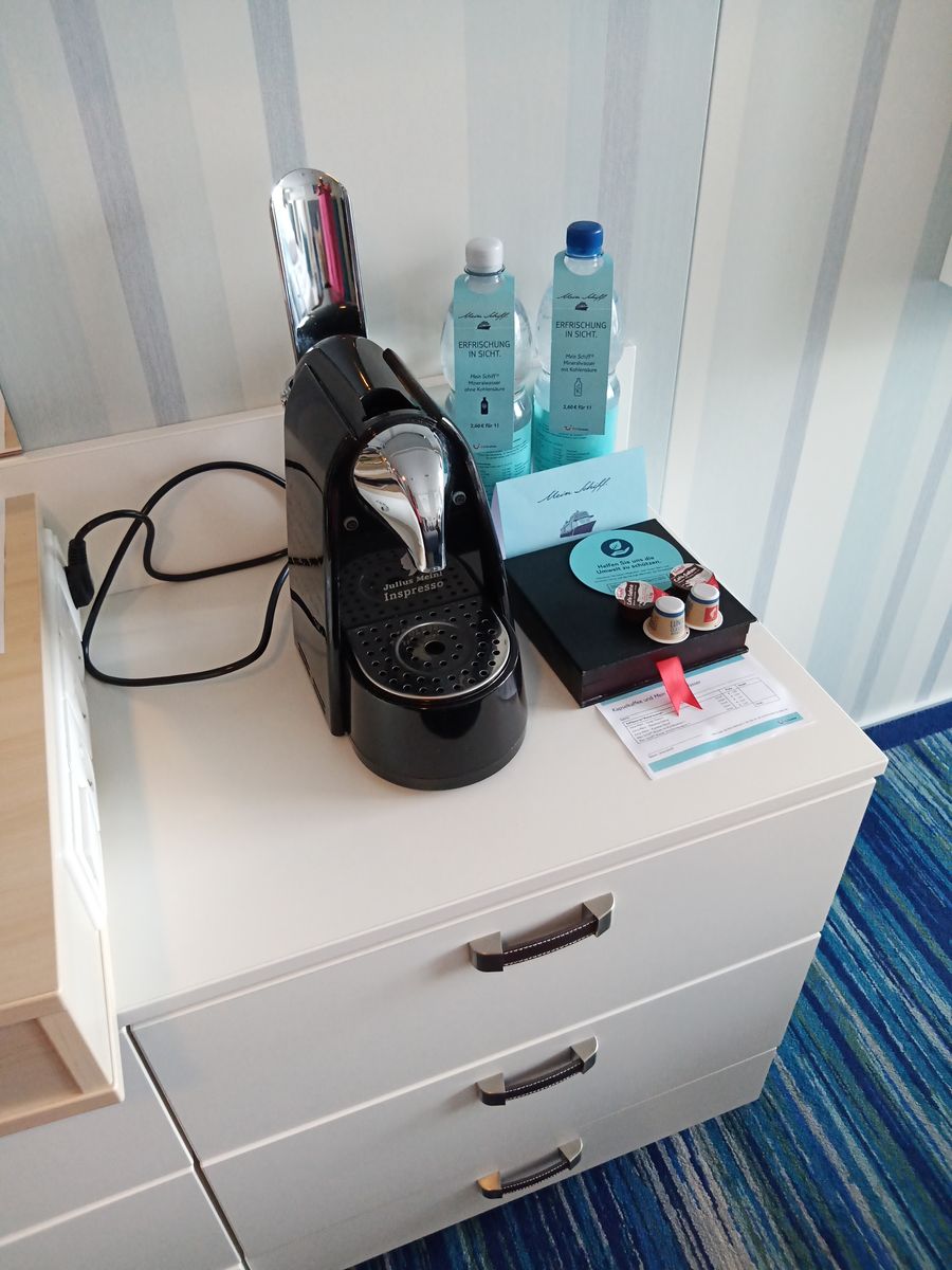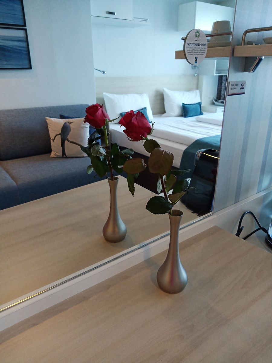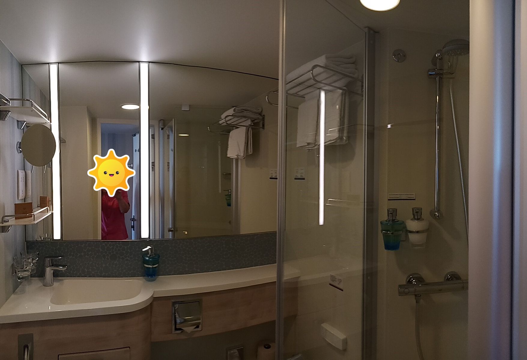 Interessant war für uns diese andere Aufteilung – so eine Art „Eingangsbereich“. Wenn man die Kabinentür von außen öffnet, schaut man nicht sofort auf die Betten der Kabine. Sondern man geht zwei, drei Schritte, dann rechts; und dann erst hat man den Blick auf die ganze Kabine. Das fand ich persönlich sehr angenehm. Schön wäre es gewesen, wenn an dieser zusätzlichen Fläche ein paar Haken gewesen wären.