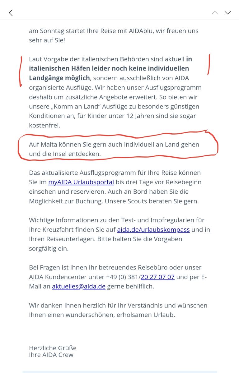 Wir werden am Dienstag in Valetta anlegen, haben zwar einen AIDA-Ausflug gebucht, aber da ab Montag auf Malta wieder individuelle Landgänge möglich sind, sind wir noch in der Überlegungsphase, den Ausflug zu stornieren.