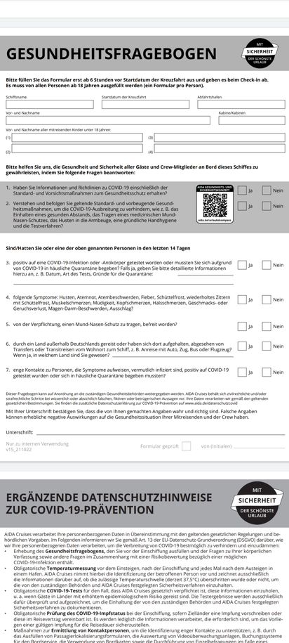 Im Gesundheitsfragebogen wird auch gefragt, ob man sich die letzte 14 Tage in einem Hochrisikogebiet aufgehalten hat. Wir sind nun schon seit Sonntag in Deutschland, und machen gerade eine Quarantäne wegen unsere beiden kleinen Kinder. Wir würden uns sehr ärgern, wenn wir nicht aufs Schiff dürfen. Von Aida bekommen wir nur die Info, Sie wissen das Österreich im Lockdown ist und wir müssen uns selber informieren ob wir aufs Schiff dürfen. Können aber auch stornieren, wenn wir wollen. Alles sehr schwammig gerade und wir rechnen schon fast damit das wir Samstag in Steinwerder stehen und wir nicht drauf kommen.