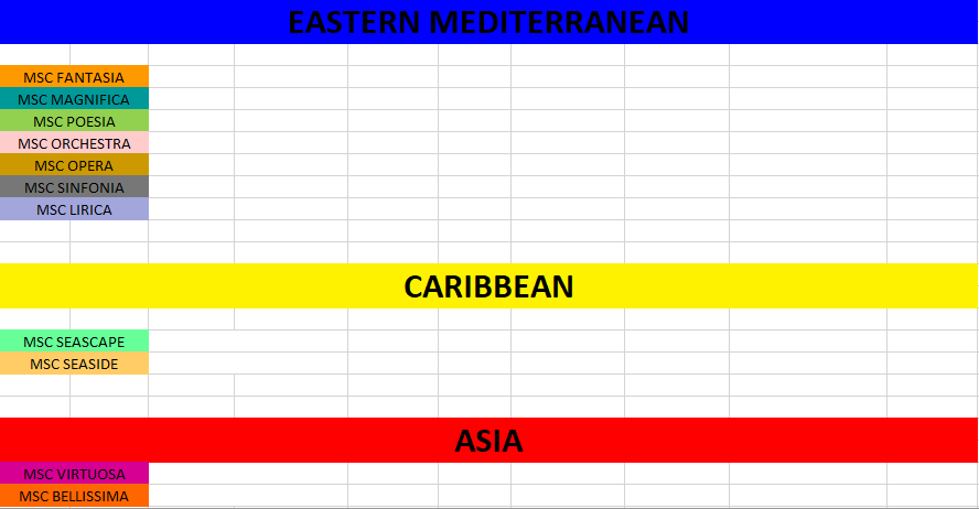 MSC Grandiosa: 10/9, 17/9, 24/9, 1/10, 8/10 & 21/10.