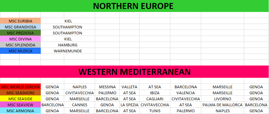 MSC ändert immer freudig seine Planungen, weshalb oft schwer einzuschätzen ist, welches Schiff wo eingesetzt wird und welche Meldungen wirklich aktuell sind. Oft ändert MSC auch nach Veröffentlichung der Reisen die Routen aufgrund irgendwelcher spontaner Agreements mit Häfen (z.B. Saudi Arabien im Orient, Orlando statt zweites Schiff in Miami, Opera soll 2022 als zweites Schiff Tunis im Sommer anlaufen (angekündigt, noch nicht vollzogen), von hareid angesprochener noch nicht offizieller Tausch von Preziosa und Magnifica in 2022,...). Eine solche Planänderung dürfte auch die schon angesprochene Nordeuropa Aufteilung (Meraviglia Klasse statt Preziosa 2023 in Southampton) sein. Bis vor kurzem gab es außerdem beispielsweise in Palma und Ibiza entsprechende Meldungen, die Grandiosa auf der Cannes Route und die Seaview auf der Ibiza-Livorno Route nahe gelegt hätten, was mit der bereits buchbaren Europa folgende Verteilung im WMM nahe gelegt hätte:
