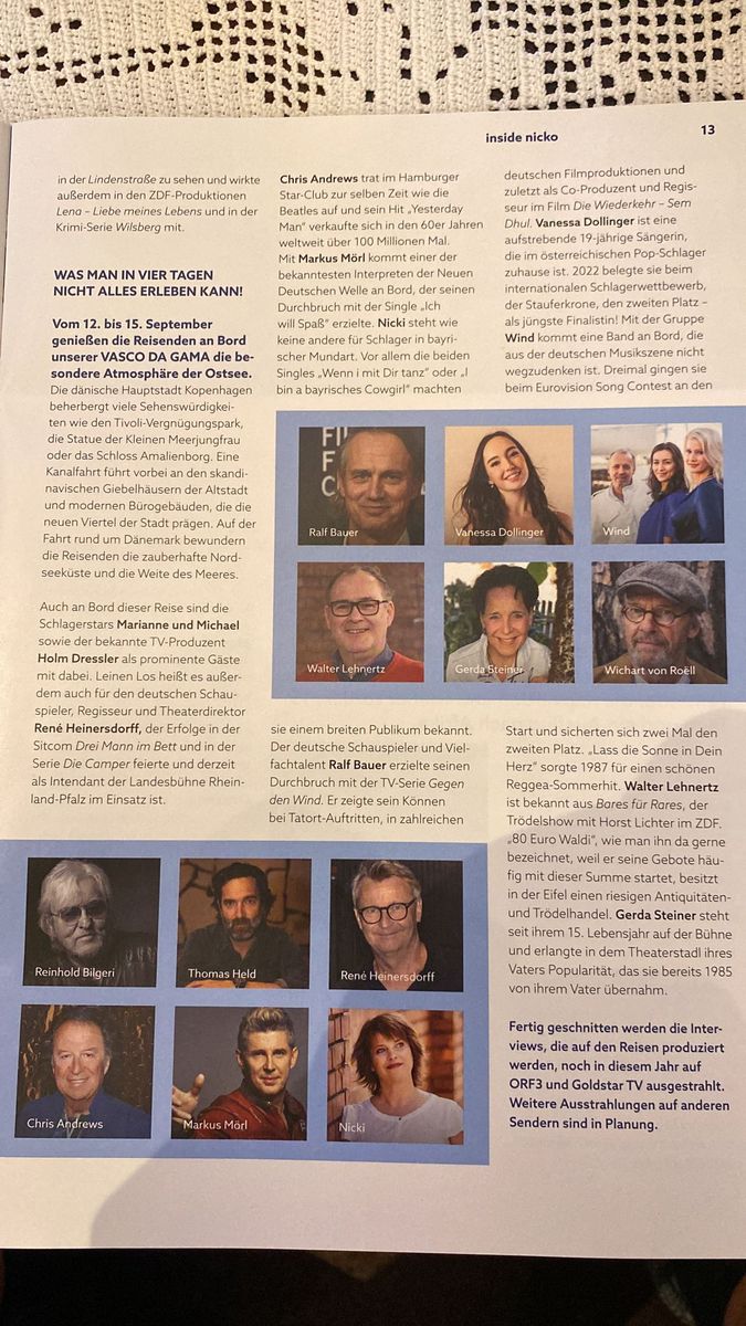 Die Schlagerstars mögen wohl auch Kreuzfahrten....wenn man nämlich da klickt, wo Du nicht klicken willst, gibt es verschiedene Sendungen mit denen auf Schiffen: Costa, MSC, dann wohl demnächst VdG. Und was ich so sehe, nicht nur so Auslaufmodelle wie Chris Andrews sondern durchaus heutige "Stars" wie Gabalier...ich bin beim Zappen bisher immer drübergegangen, aber wenn das teilweise Schiffsaufnahmen sind, dann werde ich da schon mal einschalten. Interessiert mich....