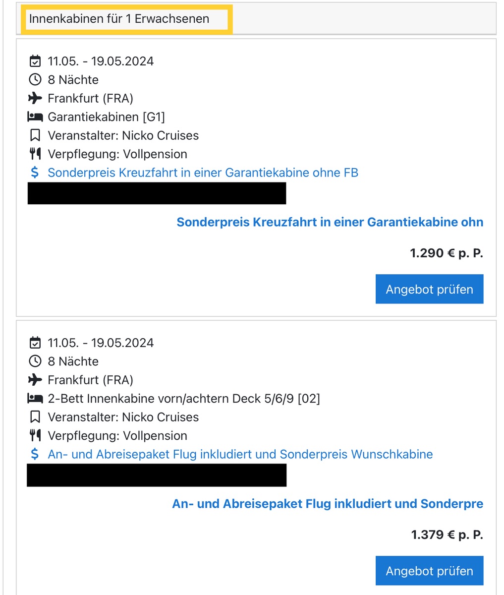 Ein anderer Anbieter bietet laut seiner Webseite die Reise für 1499 IK my Choice inc. Flug ab FRA an.