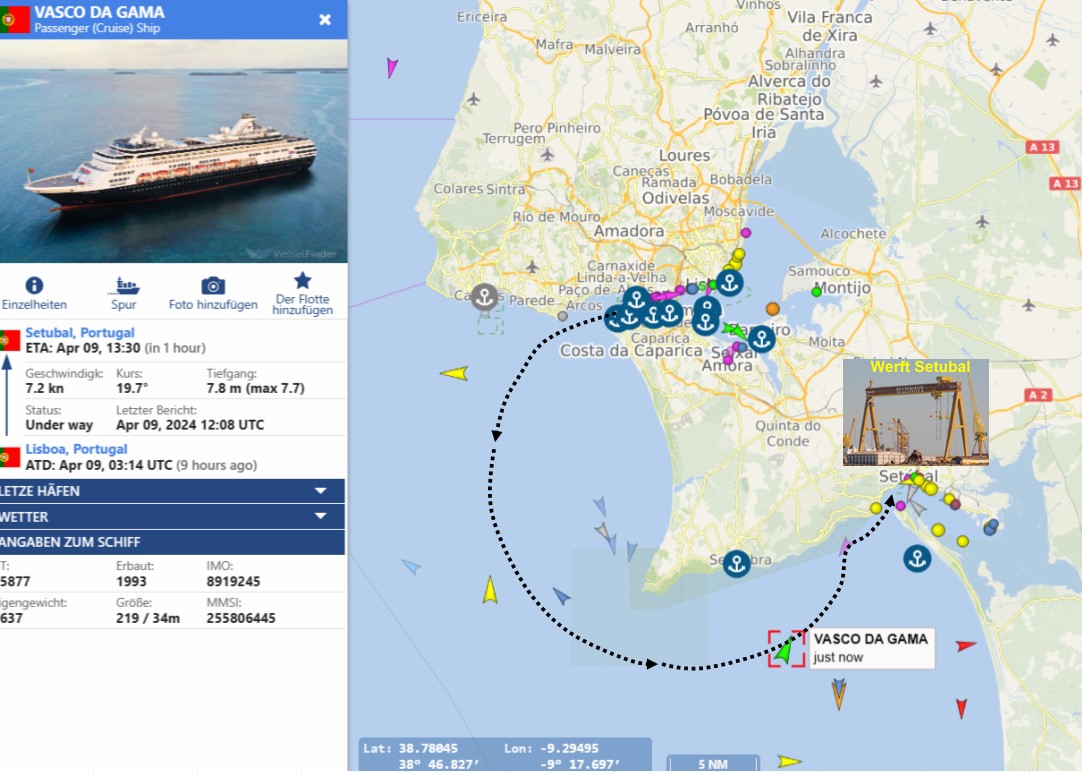 die VdG hat heute Lissabon verlassen mit Kurs nach Setubal (Werftaufenthalt), Ankunft vsl. heute Nachmittag.