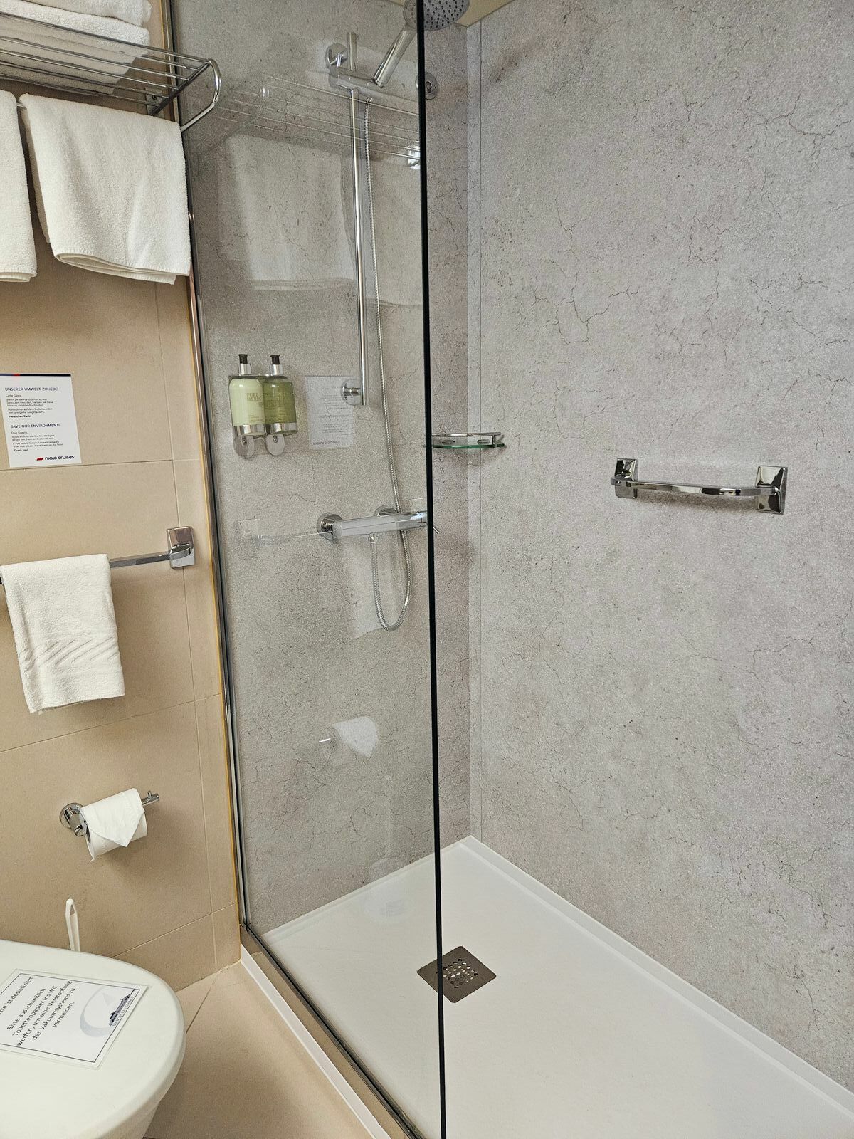die Duschen in der VdG sind (wie auch bei den renovierten Phoenix-) deutlich größer, haben die Grundfläche der alten Badewanne, da ist genügend Platz für den Haltegriff. Mach den mal in die kleinen Eckduschen bei AIDAs rein - eine nicht ganz so schlanke Person hätte dann Platzprobleme