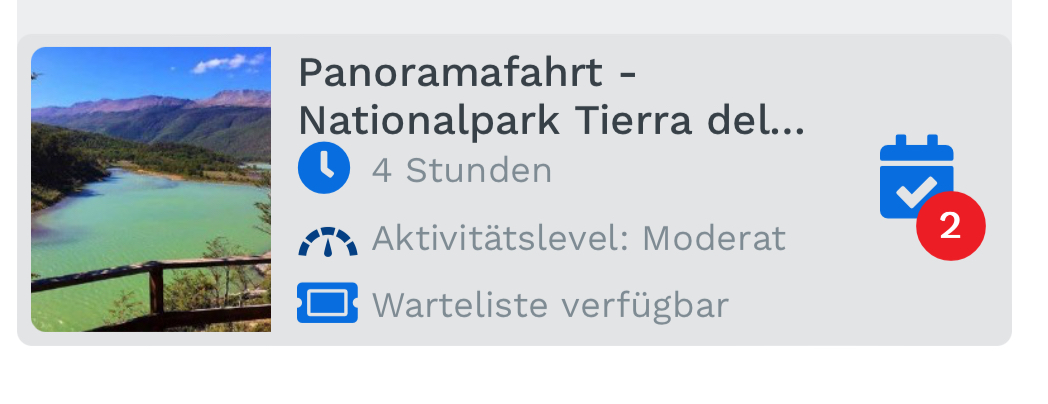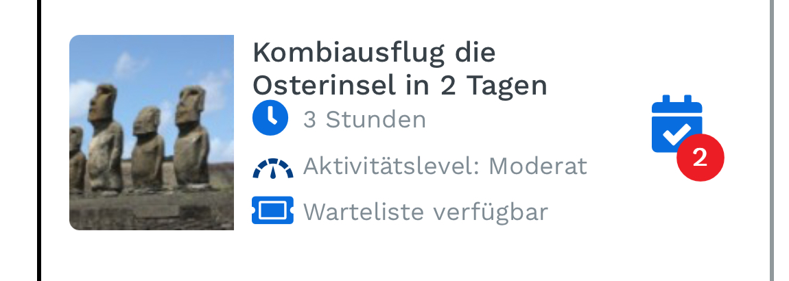 Oder eine Sanduhr, die aussagt, dass Du auf der Warteliste stehst. Die Zahl im roten Punkt zeigt die Anzahl der von Dir in den Ausflug eingebuchten Passagiere. -