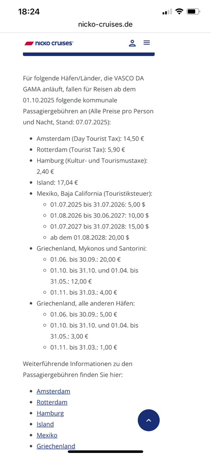 … Kommunale Passagiergebühren (wie zum Beispiel Kurtaxen, Tourismusabgaben etc.) sind nicht im Reisepreis enthalten und werden tagesaktuell Ihrem Bordkonto belastet.