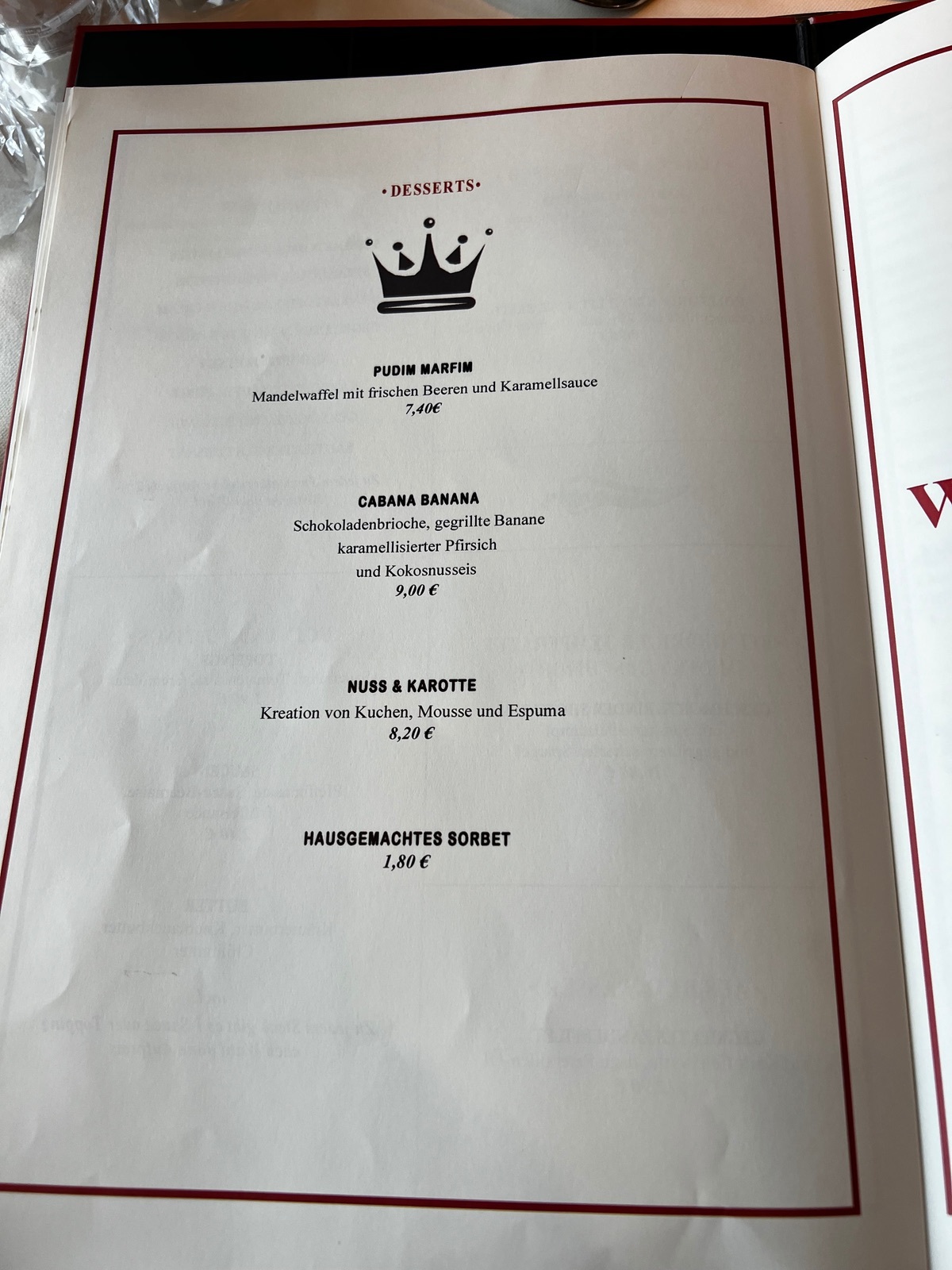 Wir haben im Vorfeld überlegt, ob wir das kleine Paket für € 33pP und Tag buchen und sind im Nachhinein froh, es nicht getan zu haben. Warum? Die 3 Hausweine schmecken uns nicht, und andere offene Weine gibt es nicht.
