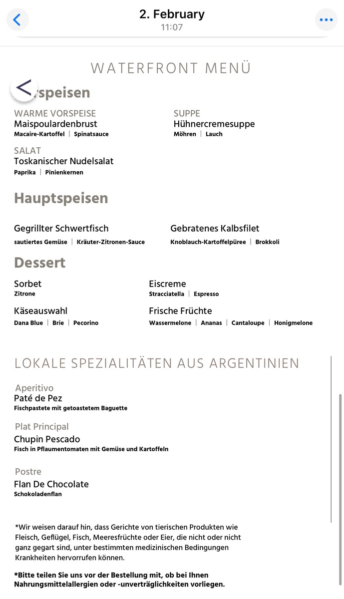 Hier mal die Speisekarten der drei Bedienrestaurants auf der Vasco da Gama. Das vegane Menü ist in allen drei Restaurants in gleicher Form erhältlich. Innerhalb eines Restaurants lassen sich alle angebotenen Soeisen miteinander kombinieren. Also z.B. Vorspeise vegan, Hauptgang argentinisch, Nachspeise aus der normalen Auswahl. Man kann auch soviel Speisen bestellen wie man will. Z.B. drei Vorspeisen, zwei Hauptgänge, vier Desserts. Man sollte das dann aber auch aufessen können.