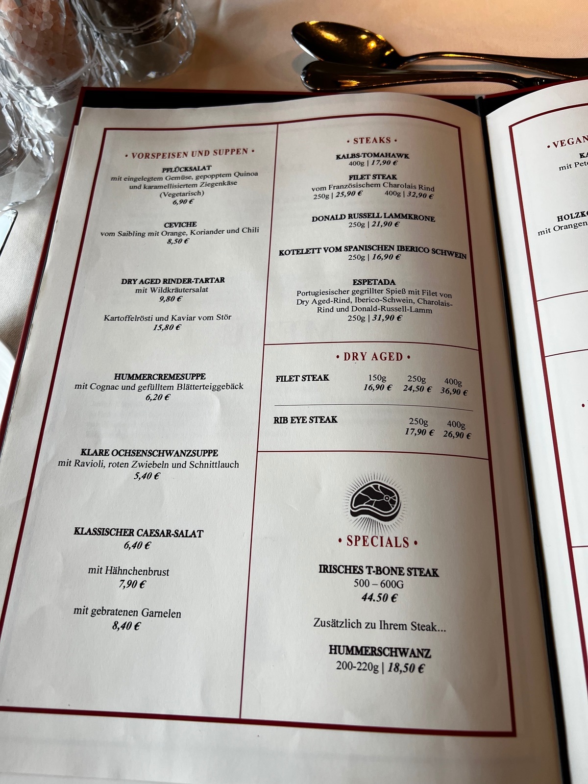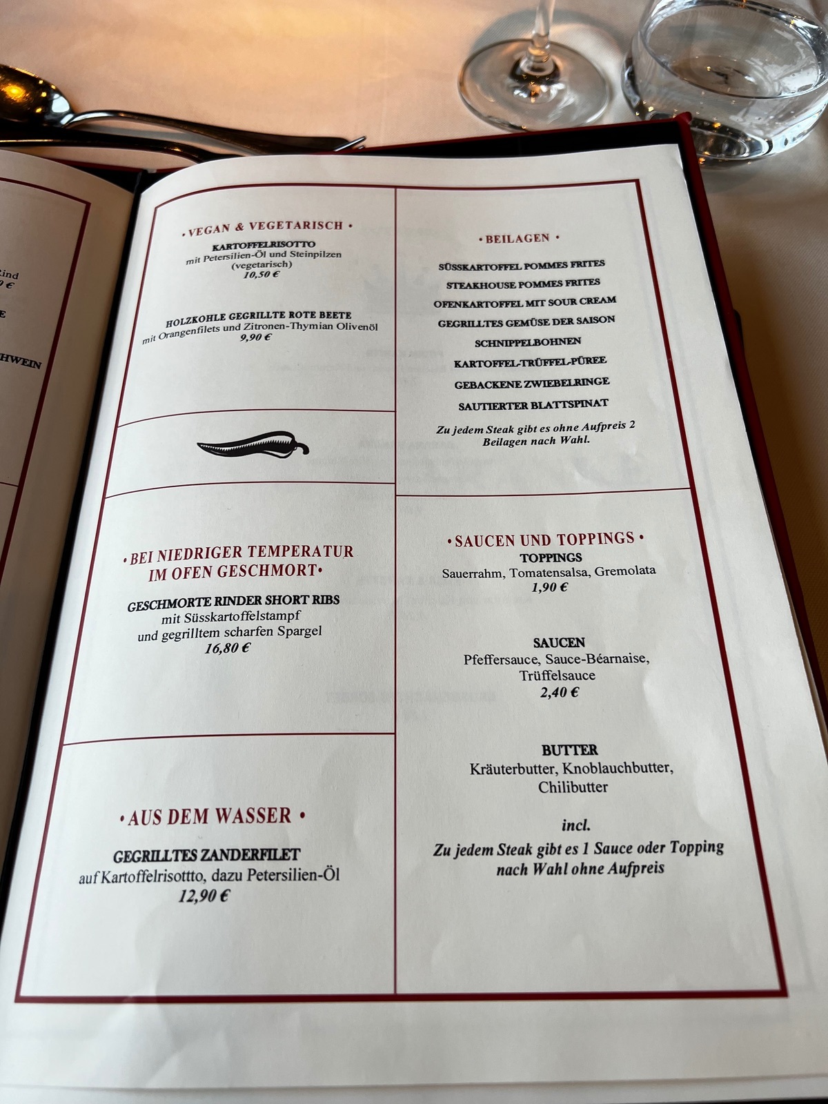 Wenn man vorhat, ins Steakhaus zu gehen, sollte man an den ersten zwei Tagen des Reiseabschnitts eine Reservierung vornehmen. Die kann für jedem belieben Tag der Reise sein, es muss nur an den ersten beiden Tagen reserviert werden. Da gibt es nämlich 25% auf die Speisen. Ich schreibe bewusst Reiseabschnitt, denn es geht nicht um die individuelle Reise sondern um eine neu beginnende Strecke. Wer also mehr als einen Reiseabschnitt fährt, kann die Ermäßigung mehrfach in Anspruch nehmen.