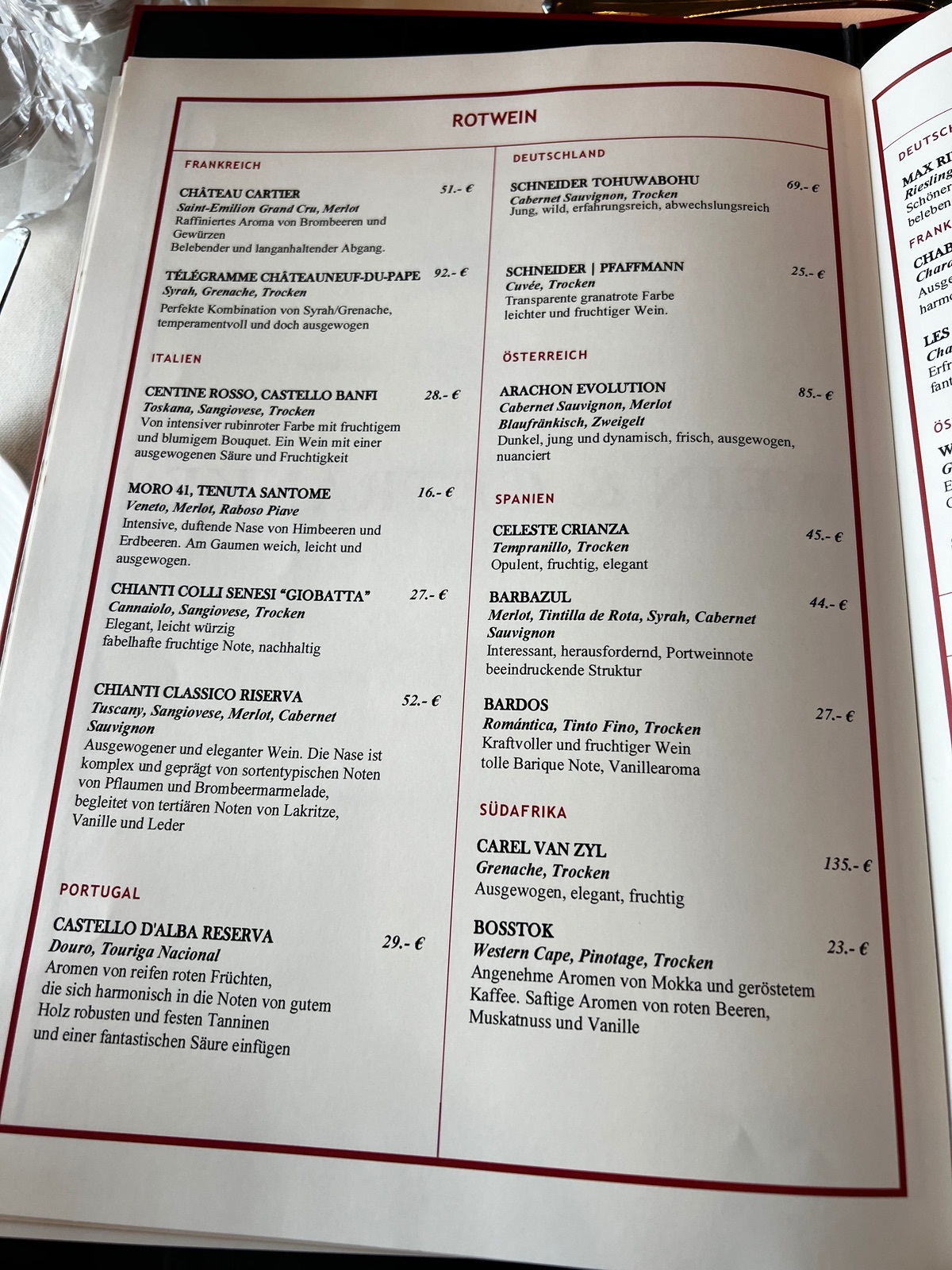 Wir haben im Vorfeld überlegt, ob wir das kleine Paket für € 33pP und Tag buchen und sind im Nachhinein froh, es nicht getan zu haben. Warum? Die 3 Hausweine schmecken uns nicht, und andere offene Weine gibt es nicht.