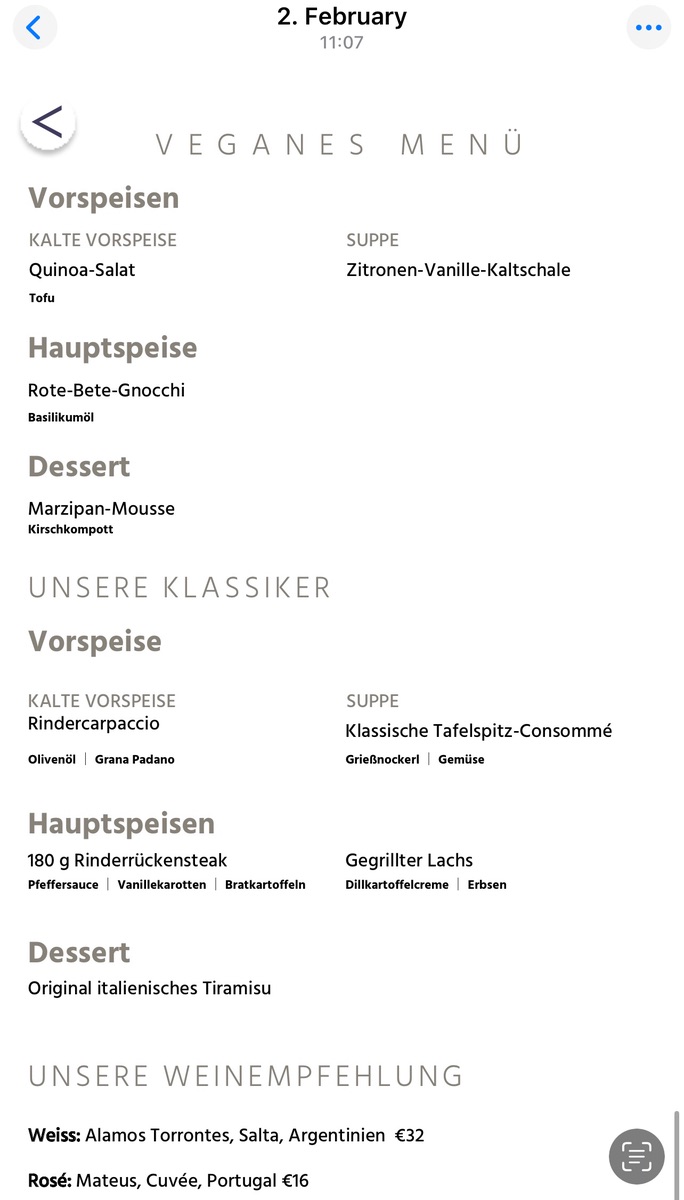 Wir haben im Vorfeld überlegt, ob wir das kleine Paket für € 33pP und Tag buchen und sind im Nachhinein froh, es nicht getan zu haben. Warum? Die 3 Hausweine schmecken uns nicht, und andere offene Weine gibt es nicht.
