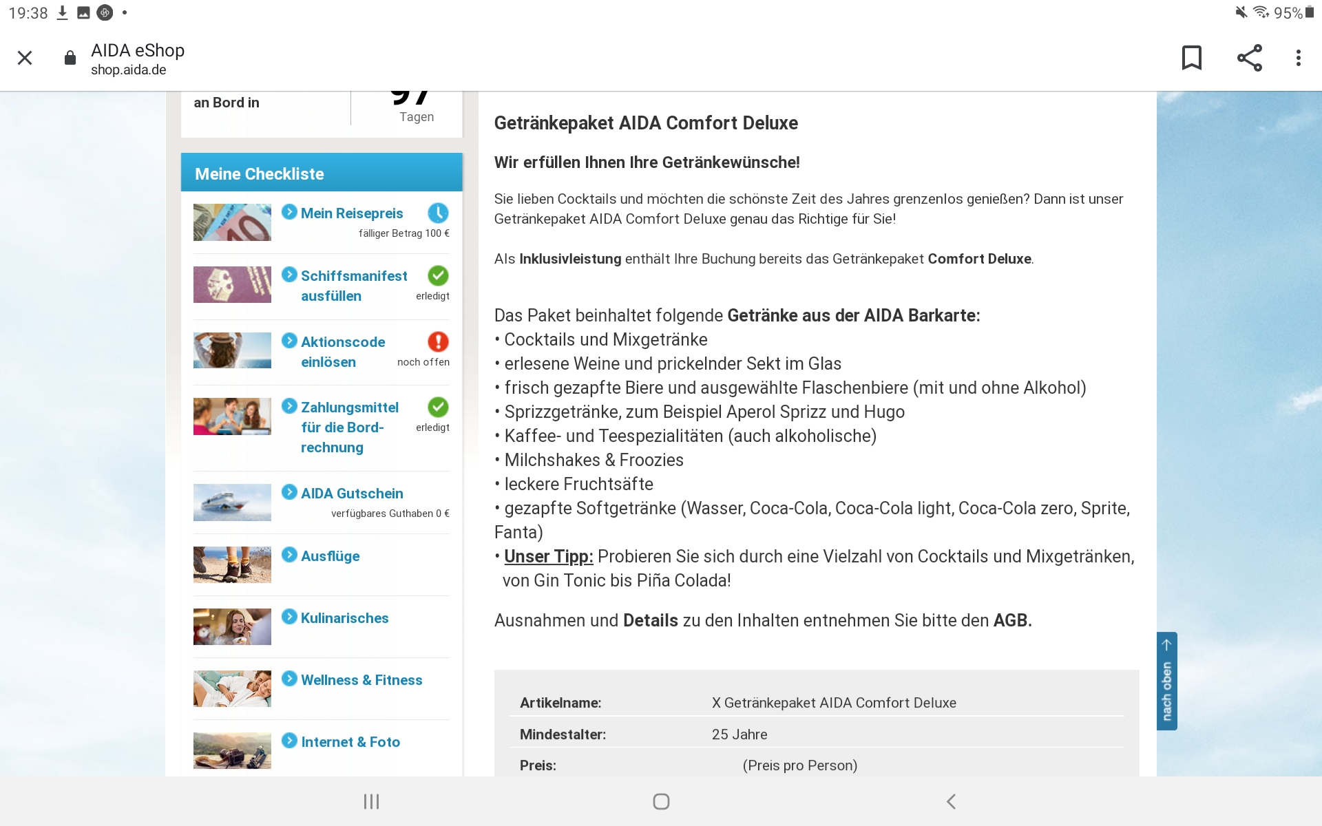 Habe am Morgen des 19.08.2021 zu einem günstigen Preis eine Pauschalreise mit der AIDAblu gebucht, bei der laut Angebot im AIDA-Buchungsportal ein umfangreiches Getränkepaket sowie Sie Social Media Flatrate bereits als Leistung inkludiert waren (Tarif Pauschal All inklusive). Obwohl diese Leistungen explizit auch in meinem persönlichen MyAIDA-Reiseportal mit dem Slogan "Alles drin, alle glücklich" dokumentiert waren, enthielt die einen Tag später eintreffende Buchungsbestätigung hierzu keinerlei Hinweise.