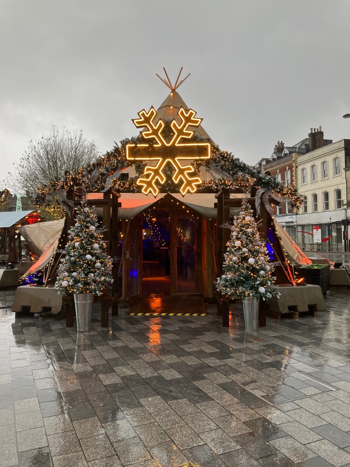 Die Stadt ist echt süß, gefällt mir sehr gut, und die Kathedrale habe ich auch schon besichtigt. Jetzt geht aber regen-technisch erstmal gar nichts mehr, und ich sitze in diesem Zelt auf dem Weihnachtsmarkt und trinke einen Kaffee unterm Heizstrahler: