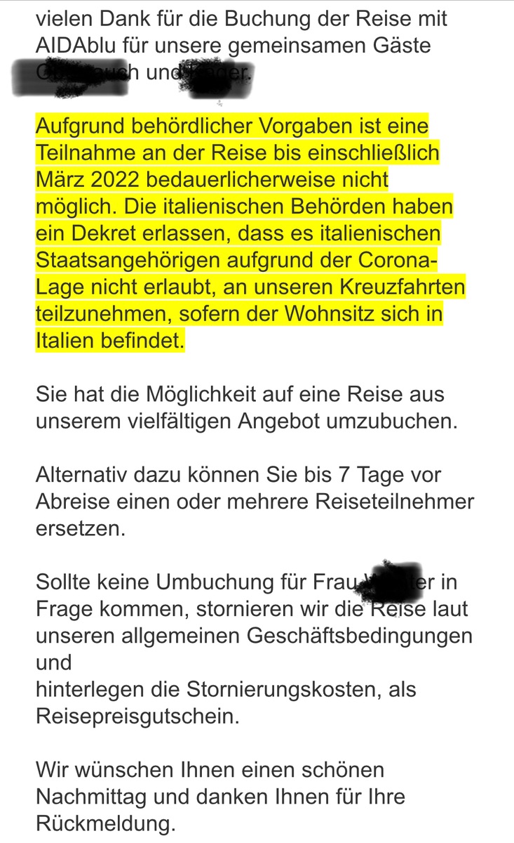 Aida verkauft seine Stornierungen gerne als Kunden-Stornierung. Ich habe auch eine Email erhalten, nachdem Aida meine Luna-Reise storniert hat, in der steht: "Hiermit bestätigen wir Ihnen die Stornierung Ihrer Reise" und im Anhang ist ein PDF und hier steht: "Informationen zu Ihren Stornogebühren: 0,00 Euro". Für mich liest sich das so, als hätte ich storniert. Aber vllt bin ich auch überempfindlich nach all den Absagen