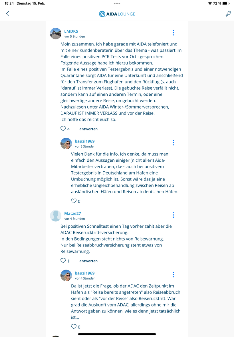 Aida hatte auf Rückfrage geantwortet, dass der andere reisen könnte, wenn einer schon zu Hause positiv wäre… aber in dem Fall müsste ja ich, die nicht gemachte Reise, bezahlen oder die andere Partei den Einzelkabinenzuschlag…