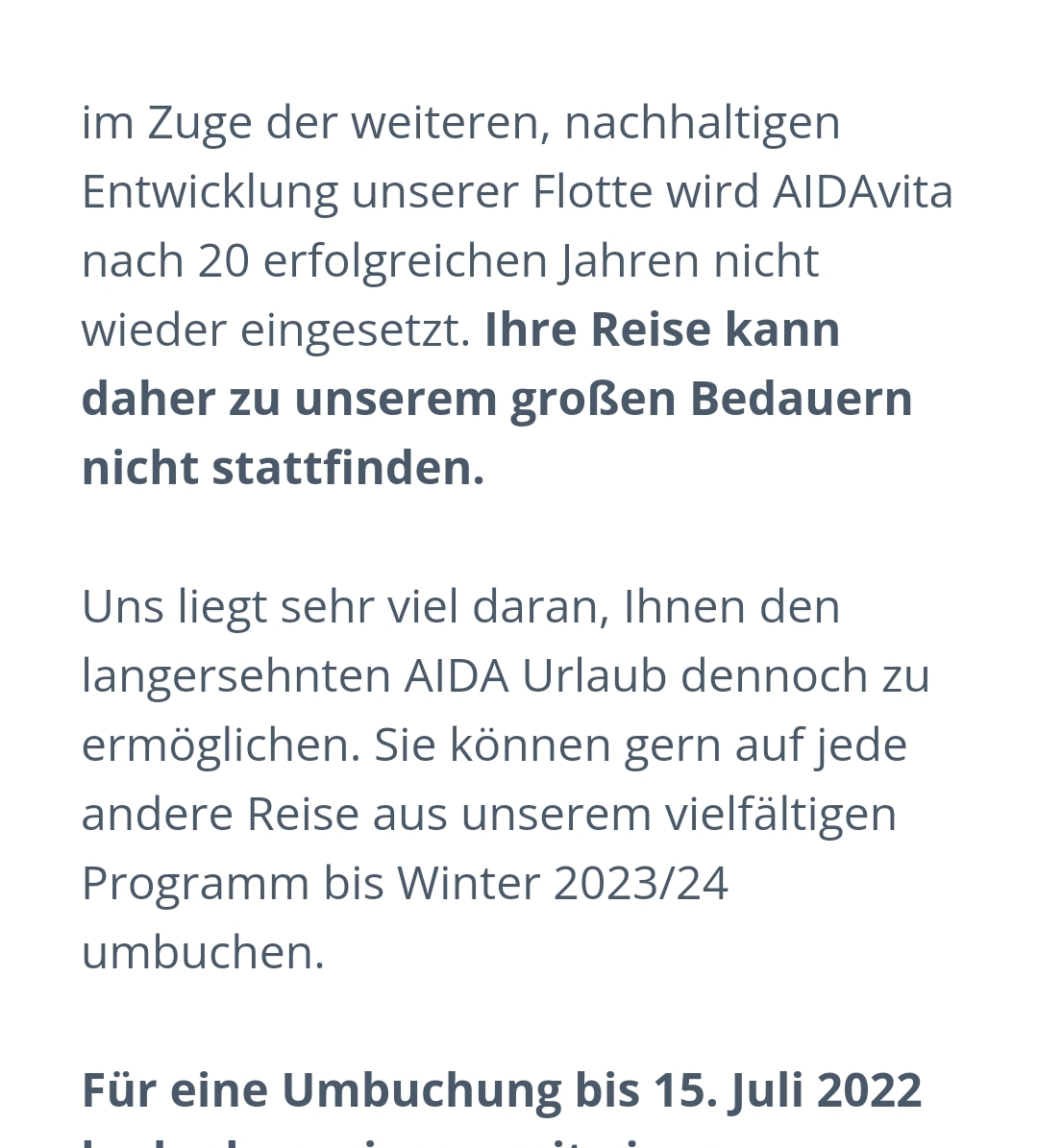 Aber die richtige Stornierungsmail gab es noch nicht, oder? Wir haben witzigerweise das für die Vita Reise noch nicht bekommen, auch keine Info das es nicht stattfindet.
