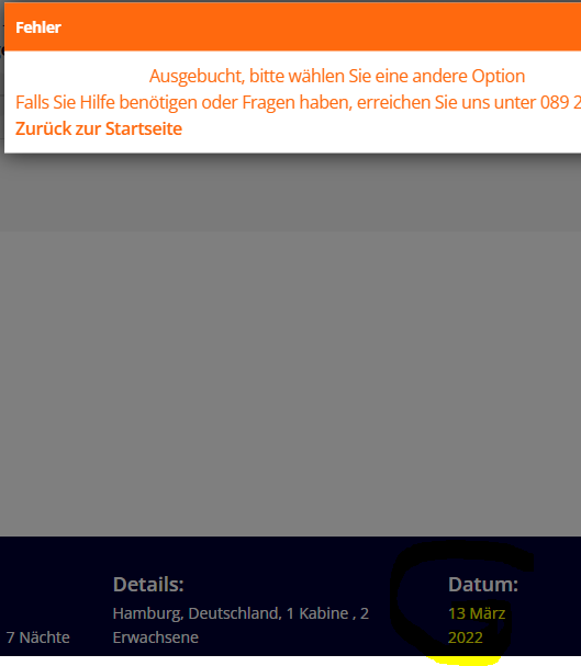 Eure Abfahrt 27.02 kann man noch buchen, aber unsere Abfahrt 13.3. kommt eine Fehlermeldung
