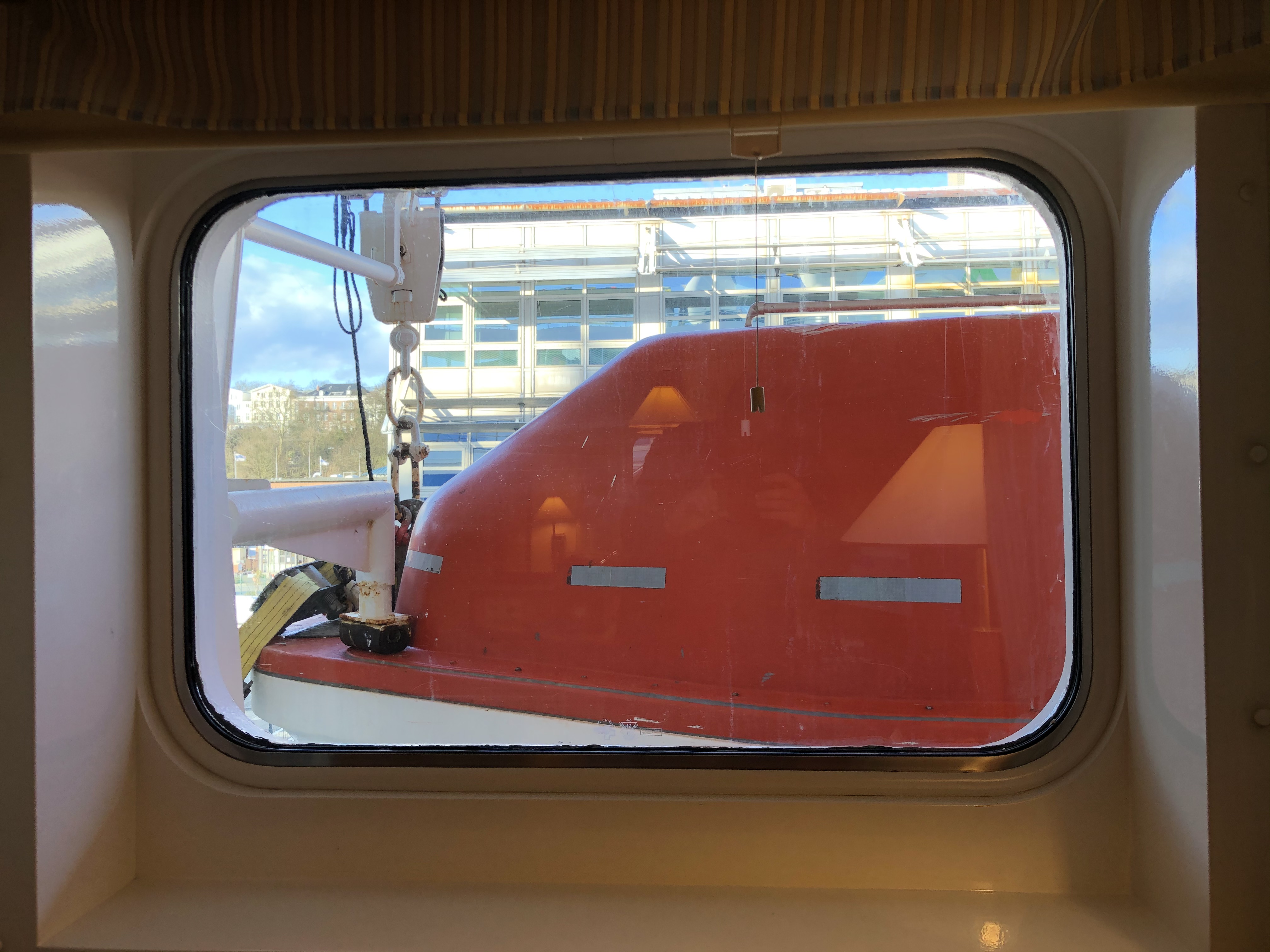 Die Sichtbeeinträchtigung ist der vordere Teil eines Rettungsbootes, aber man kan wirklich genügend sehen und die Kabine ist auch tagsüber sehr hell. Ich empfand das als keine schlimme Beeinträchtigung. Man kann prima links am Botte vorbeisehen.