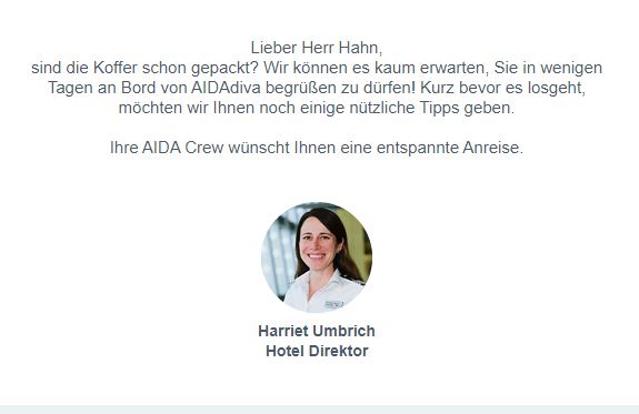 habe natürlichim Manifest den Flugangegeben und heute eine Mail an Aida geschrieben. Die Frage war ja, ob jemanden so einen Fall kennt und wie gehandhabt wurde.